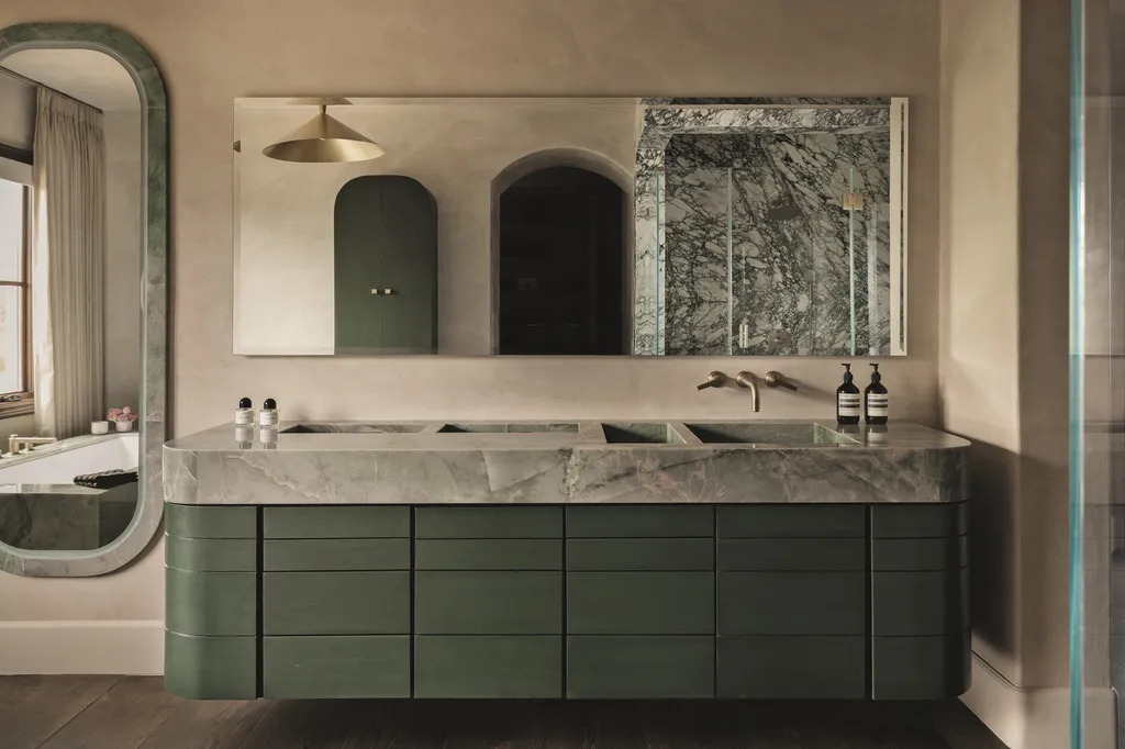 Για το χρωματικό συνδυασμό του σπιτιού, η Huma εμπνεύστηκε από ένα κοντινό φυσικό καταφύγιο, επιλέγοντας χρώματα που συμπληρώνουν την πλούσια βλάστηση και την θέα στο φαράγγι. Αποχρώσεις της ελιάς, της σκουριάς, του πράσινου, του απαλού ροζ και του off-white κυριαρχούν στο σπίτι, δημιουργώντας μια γαλήνια, συνεκτική ατμόσφαιρα. «Οι πελάτες μου αγαπούν το χρώμα, αλλά ήθελαν να χρησιμοποιηθεί με πολύ διακριτικό τρόπο. Εμπνευστήκαμε από το φυσικό περιβάλλον – τον κάκτο και τους πράσινους θάμνους – και επιλέξαμε συμπληρωματικούς τόνους που θα συνδυάζονταν άψογα με το περιβάλλον» εξηγεί η Huma.