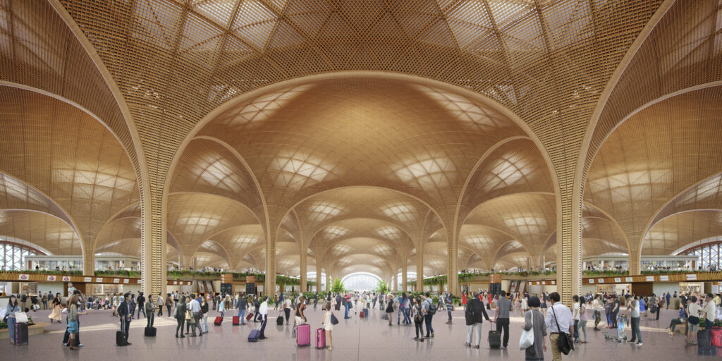 Πλημμυρισμένο από φυσικό φως, ο τερματικός σταθμός είναι γεμάτος με πλούσια βλάστηση, με ώριμα δέντρα να υψώνονται μέσα από το πανύψηλο κεντρικό ”κενό” και φύτευση στις άκρες που μαλακώνει τους εσωτερικούς χώρους. Ο τερματικός σταθμός θα λειτουργεί επίσης σχεδόν εξ ολοκλήρου με ενέργεια που παράγεται από ένα φωτοβολταϊκό πάρκο στις εγκαταστάσεις του.