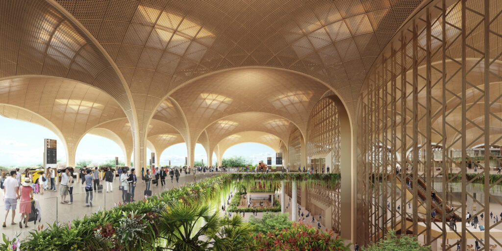 Η οροφή – που υποστηρίζεται από δομικά δέντρα μήκους 36 μέτρων – είναι ένα ελαφρύ κέλυφος από ατσάλινο πλέγμα, με ένα καινοτόμο επίπεδο που φιλτράρει το φως της ημέρας και φωτίζει τον τεράστιο χώρο του τερματικού σταθμού. Φιλοδοξώντας να γίνει ένα από τα πιο πράσινα αεροδρόμια στον κόσμο, το έργο υιοθετεί μια βιώσιμη σχεδιαστική προσέγγιση, συνδυάζοντας την τελευταία λέξη της τεχνολογίας με την τοπική κατασκευαστική τέχνη, ελαχιστοποιώντας παράλληλα το λειτουργικό κόστος.