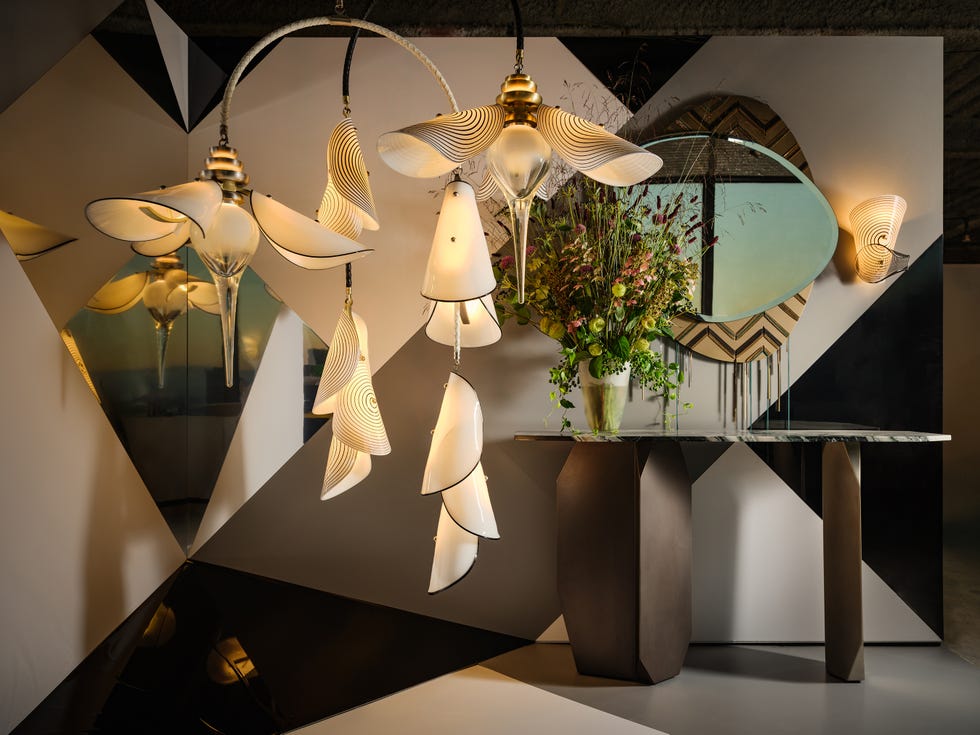 Στην Collectible, το Avram Rusu Studio παρουσίασε νέες προσθήκες στη συλλογή Botanica βιοφιλικών πολυελαίων, κατασκευασμένων από γυαλί και πλεγμένο δέρμα, εμπνευσμένων από κρεμαστά λουλούδια μπανάνας. Ιδρυμένο από την καλλιτέχνιδα Andreea Avram Rusu, γεννημένη στη Ρουμανία, το στούντιο με έδρα τη Νέα Υόρκη συνεργάζεται με μια ομάδα ντόπιων υαλουργών και μεταλλουργών για την παραγωγή των θεατρικών του δημιουργιών. Τα έργα είναι αγαπημένα μεταξύ των σχεδιαστών, συμπεριλαμβανομένης της Rajni Alex, η οποία χρησιμοποίησε έναν αιθέριο πολυέλαιο στο δωμάτιό της στο πιο πρόσφατο Kips Bay Show House Palm Beach.