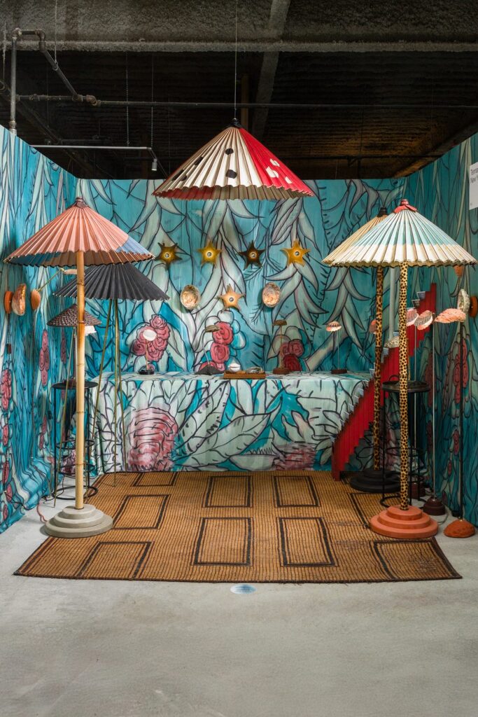 Στο περίπτερο του Tennant New York, ο Christopher Tennant έκανε αίσθηση με τα τελευταία του σχέδια φωτισμού φτιαγμένα από κοχύλια, ένα υλικό με το οποίο εργάζεται από το 2022. «Όταν είσαι κατασκευαστής λαμπτήρων, όλα είναι μια σκιά» λέει. «Η ιδέα ήταν να πάρω μερικές από τις πιο ανθεκτικές και λειτουργικές σιλουέτες φωτιστικών των αρχών του 20ού αιώνα και να τις αποδώσω με φυσικά υλικά – κοχύλια, μπαμπού, δέρμα, γύψο, μάρμαρο – κάτι που τους δίνει μια σουρεαλιστική, ελαφρώς ζωντανή, εξαιρετικά απτή και χειροποίητη ποιότητα που μου αρέσει πολύ».
