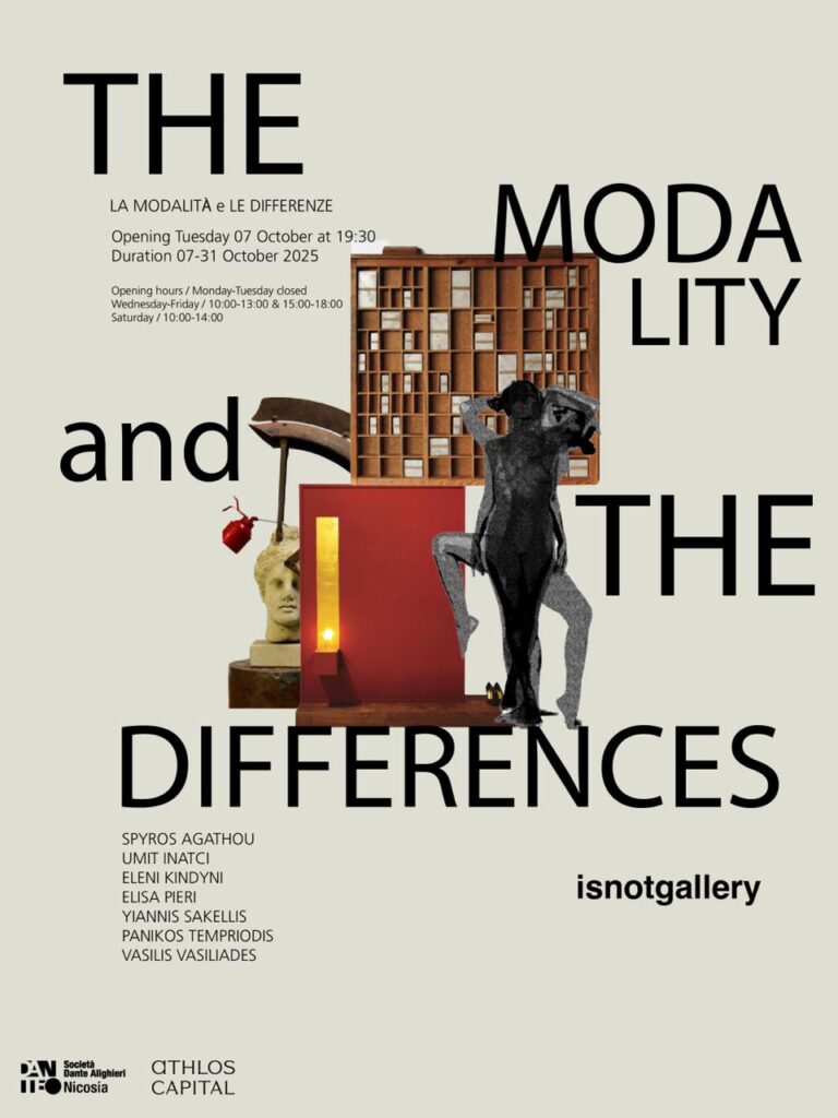Εφτά Κύπριοι καλλιτέχνες – απόφοιτοι της Ακαδημίας Καλών Τεχνών Pietro Vannucci στην Περούτζια της Ιταλίας – συγκεντρώθηκαν στην έκθεση ‘‘The Modality and the Differences’’. Τα εγκαίνια θα πραγματοποιηθούν την Τρίτη 7 Οκτωβρίου, η ώρα 19:30, στην Isnotgallery.