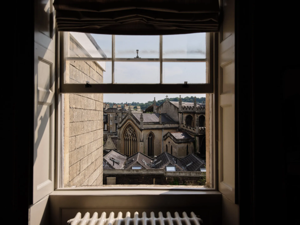 Στεγασμένο στον πρώτο όροφο ενός γεωργιανού κτηρίου – η βασίλισσα Charlotte το νοίκιασε το 1817 όταν ήρθε στο Μπαθ – το διαμέρισμα έχει μια αξιοζήλευτη διπλή όψη και ωραίες αρχιτεκτονικές λεπτομέρειες, ασυνήθιστες για ένα διαμέρισμα περίπου 103 τετραγωνικών μέτρων. «Τα ταβάνια μοιάζουν ψηλά και όταν μπαίνεις μέσα φαίνεται τεράστιο, παρόλο που δεν είναι. Υπάρχει φως που πλημμυρίζει την ανατολή και τη δύση του ηλίου, και από κάθε πλευρά βλέπεις είτε κήπους είτε προς την εκκλησία της Αγίας Μαρίας» λέει η Rosa.