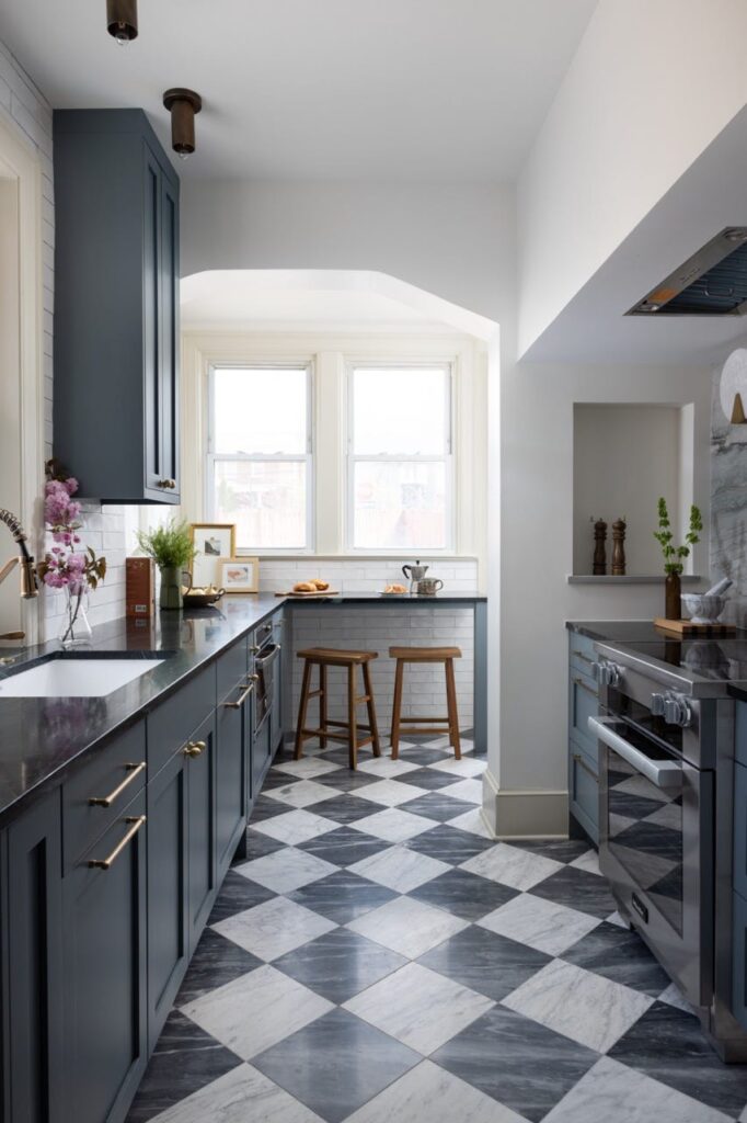 Τα ντουλάπια έχουν βαφτεί σε βαθύ μπλε-γκρι χρώμα, που προσδίδει βάθος και χαρακτήρα, ενώ οι χρυσές λαβές δίνουν μια διακριτική νότα πολυτέλειας. Το μαύρο των πάγκων συνδυάζεται όμορφα με την λευκή επένδυση πλακιδίων στον τοίχο, η οποία φέρνει φρεσκάδα και καθαρότητα στο χώρο. Το δάπεδο είναι ιδιαίτερα εντυπωσιακό, με μεγάλα τετράγωνα πλακάκια σε ασπρόμαυρο μοτίβο “σκακιέρας, που χαρίζει κίνηση και οπτικό ενδιαφέρον. Η γωνιά με τα σκαμπό κοντά στα παράθυρα προσφέρει έναν όμορφο χώρο για πρωινό ή χαλάρωση, ενώ οι μικρές λεπτομέρειες – όπως τα φυτά, τα διακοσμητικά και τα καλαίσθητα σκεύη – προσδίδουν ζεστασιά και προσωπικότητα.