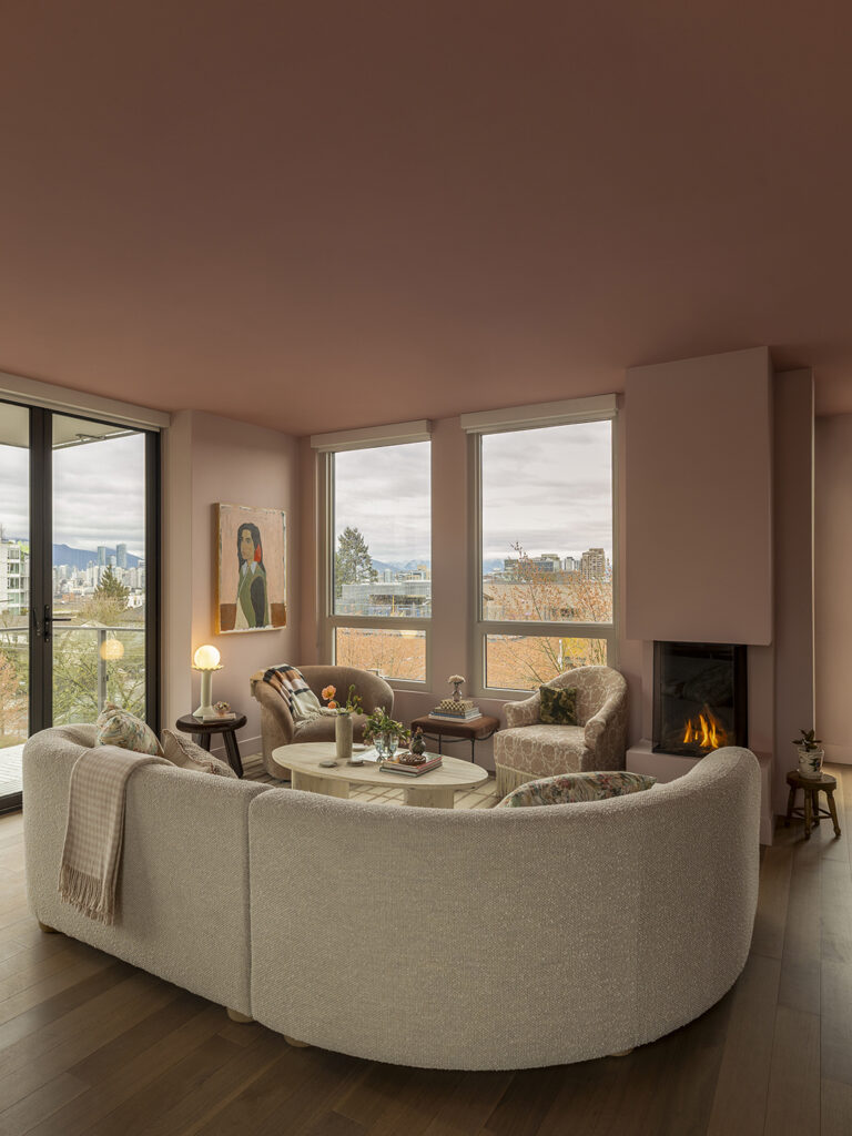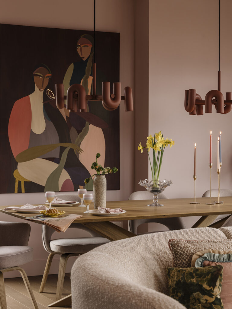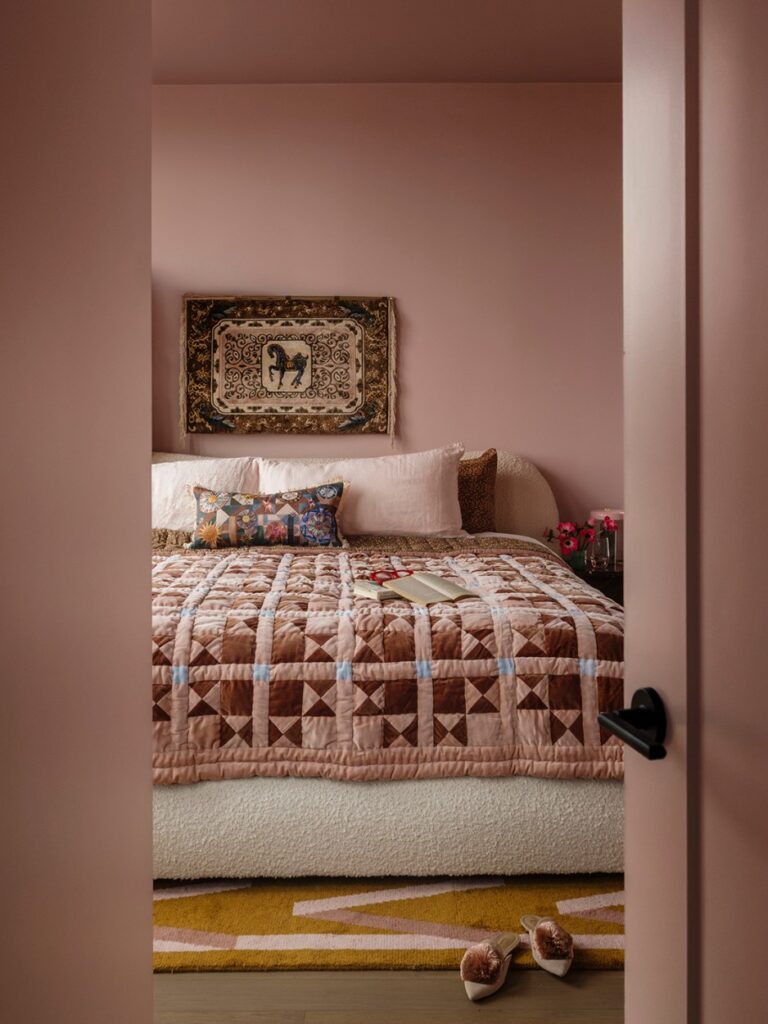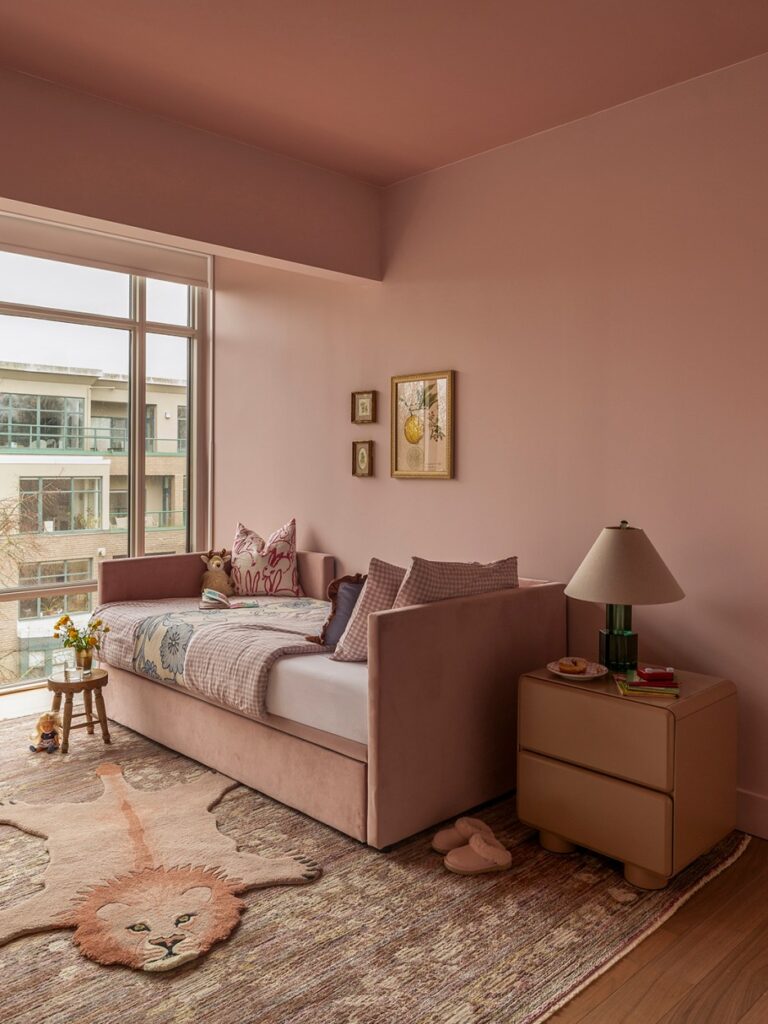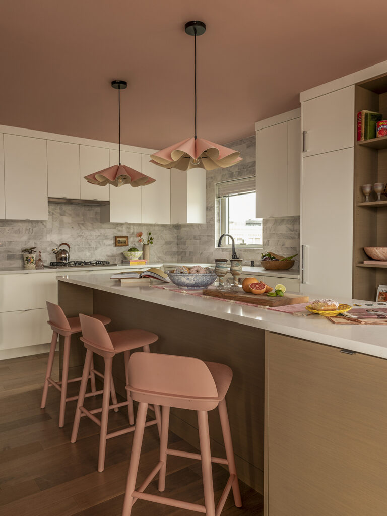 Η Royer είχε εντοπίσει στο παρελθόν την απόχρωση Amaryllis της Benjamin Moore, οπότε ήταν το πρώτο δείγμα που της ήρθε στο μυαλό. Κοιτάζοντας τα δείγματα, παρατήρησε μια άλλη απόχρωση, την Rose Lace, η οποία είχε επίσης μερικές από τις γήινες υποτονικές αποχρώσεις που έψαχνε. «Ήθελα να ποτίσω τον χώρο, συμπεριλαμβανομένης της οροφής, οπότε μου άρεσε η ιδέα να χρησιμοποιήσω δύο αποχρώσεις από την ίδια χρωματική παλέτα» εξηγεί η Royer.