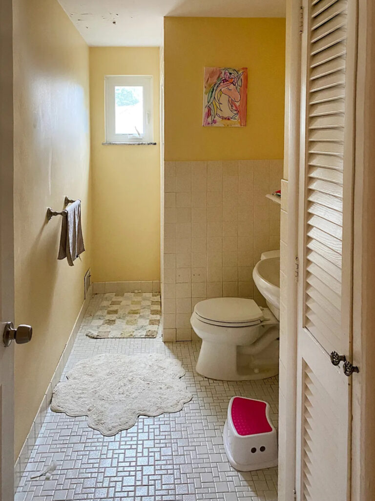 Στην αριστερή εικόνα βλέπουμε το ”πριν” του μπάνιου. Ο χώρος φαίνεται στενός και σκοτεινός, με τοίχους βαμμένους σε ένα θαμπό κίτρινο χρώμα που κάνει το δωμάτιο να δείχνει πιο παλιό. Τα πλακάκια στο πάτωμα είναι μικρά και σε θαμπό off-white, ενώ οι τοίχοι γύρω από τη λεκάνη καλύπτονται με λευκά τετράγωνα πλακάκια που δείχνουν φθαρμένα. Η διακόσμηση είναι ελάχιστη, δεν υπάρχει τίποτα που να δίνει ζωντάνια ή χαρακτήρα. Το μπάνιο μοιάζει λειτουργικό αλλά χωρίς αισθητική ανανέωση, δίνοντας την εντύπωση παλιού και ακατάστατου χώρου.