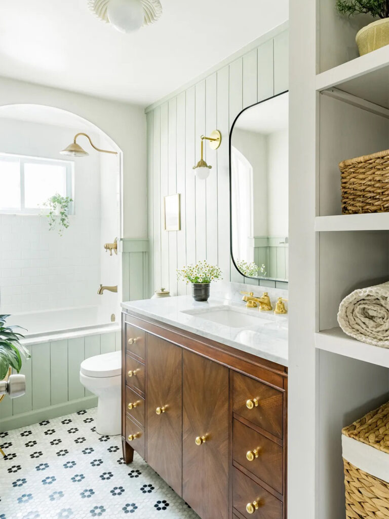 Στη δεξιά εικόνα βλέπουμε το ”μετά” της ανακαίνισης, όπου ο χώρος έχει μεταμορφωθεί πλήρως. Οι τοίχοι είναι πλέον επενδεδυμένοι με κάθετη ξύλινη επένδυση βαμμένη σε απαλό πράσινο-γκρι, που προσδίδει φρεσκάδα και κομψότητα. Το φως γεμίζει το δωμάτιο χάρη στα λευκά και ουδέτερα χρώματα, ενώ ο χρυσός χρωματισμός στα εξαρτήματα και στα φωτιστικά δίνει μια αίσθηση πολυτέλειας. Το πάτωμα έχει αλλάξει, με μοτίβο λευκών και μαύρων πλακιδίων, προσθέτοντας ρετρό αλλά κομψή πινελιά. Φυτά και καλάθια οργάνωσης ολοκληρώνουν τον χώρο, δημιουργώντας ένα φωτεινό, ζεστό και καλαίσθητο μπάνιο.