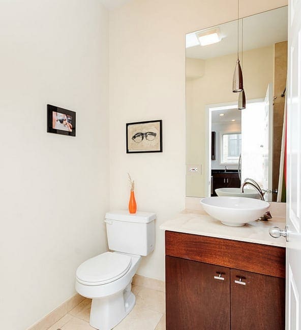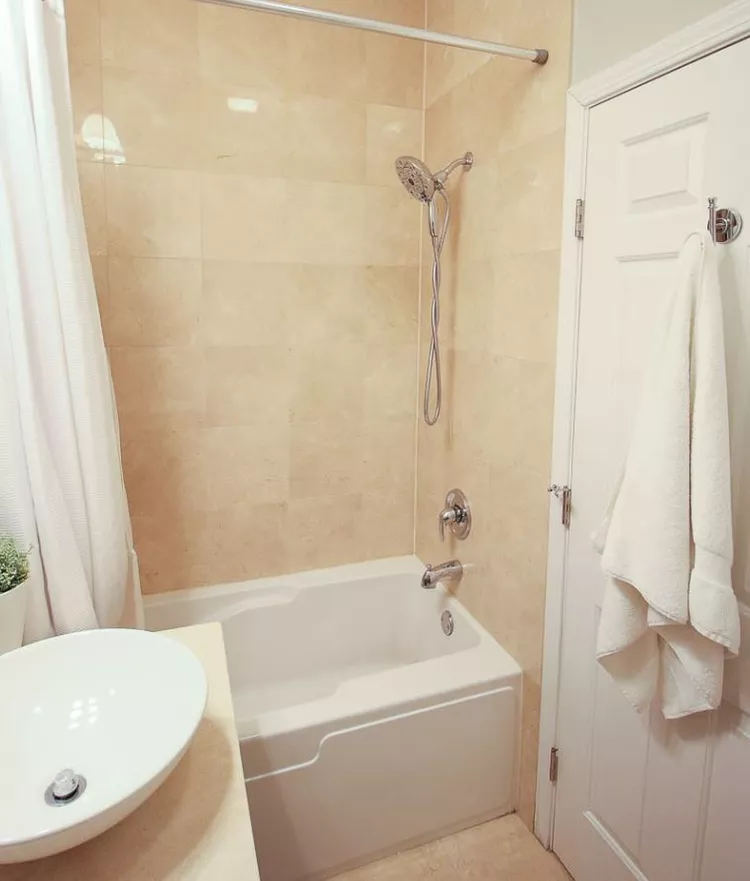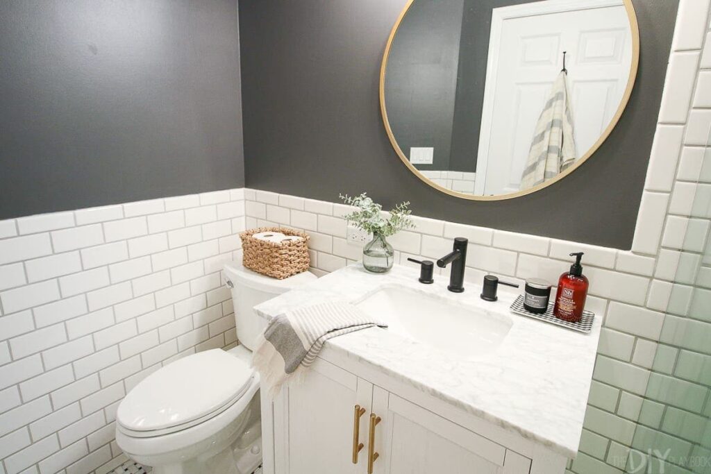Η Casey Finn, από το The DIY Playbook, ήθελε να ανακαινίσει το μικρό μπάνιο των επισκεπτών της ώστε να το κάνει πιο μοντέρνο. Ο χώρος ήταν πολύ μικρός, με παλιομοδίτικη αισθητική. Οι τοίχοι και η μπανιέρα ήταν επενδεδυμένοι με μπεζ πλακάκια, δίνοντας μια μονότονη και ελαφρώς ξεπερασμένη όψη. Η κουρτίνα του ντους ήταν πρακτική, αλλά έκανε το δωμάτιο να δείχνει ακόμη πιο στενό. Τα χρώματα ήταν ζεστά, αλλά χωρίς ιδιαίτερη προσωπικότητα, ενώ τα μεταλλικά στοιχεία (όπως η βρύση και το τηλέφωνο του ντους) ήταν απλά και τυπικά.