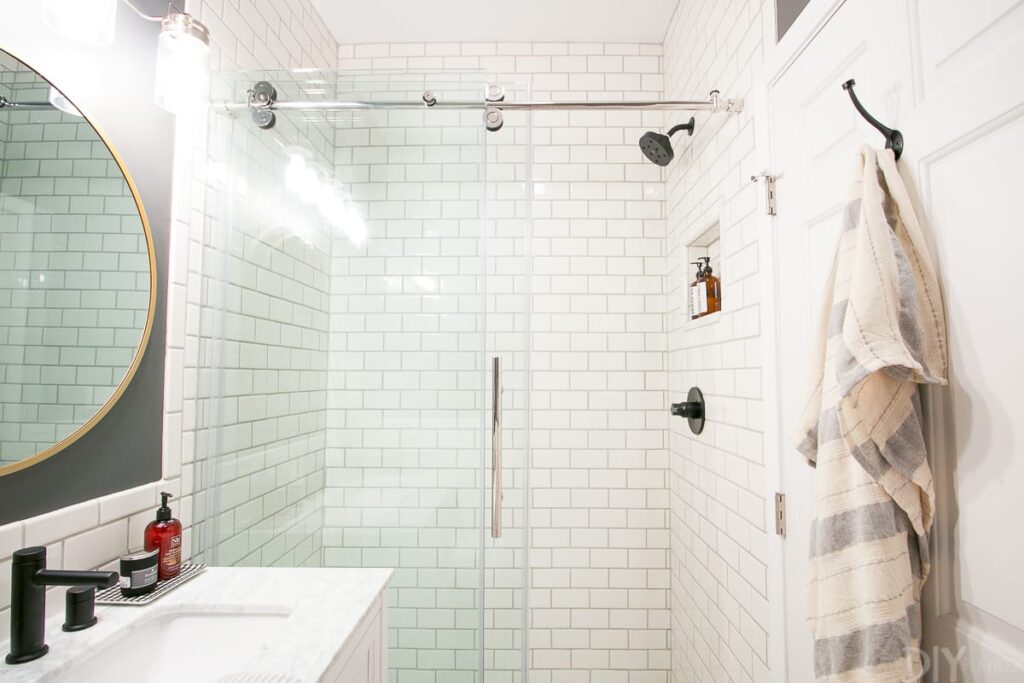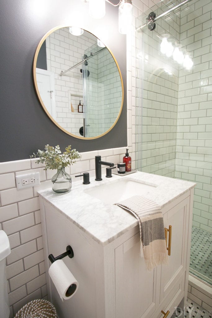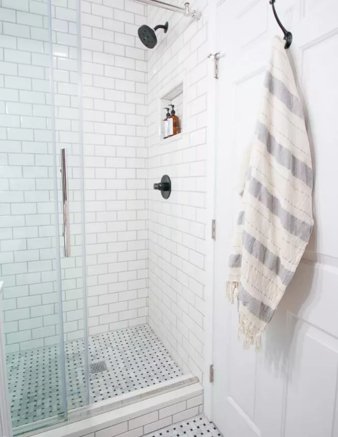 «Αφαιρώντας την μπανιέρα, μπορέσαμε να χρησιμοποιήσουμε μεγάλες γυάλινες πόρτες ντους και αυτό έκανε το δωμάτιο να φαίνεται 10 φορές μεγαλύτερο. Ενώ το μέγεθος και η κάτοψη είναι ακριβώς τα ίδια, το να μην έχουμε την κουρτίνα του ντους εδώ ανοίγει πραγματικά τον χώρο. Επιπλέον, η επέκταση των πλακιδίων μέχρι την οροφή τραβάει το βλέμμα ψηλά. Ναι, ήταν κόπος να τοποθετήσουμε πλακάκια τόσο ψηλά… αλλά άξιζε όλη την επιπλέον προσπάθεια» εξηγεί η Casey.