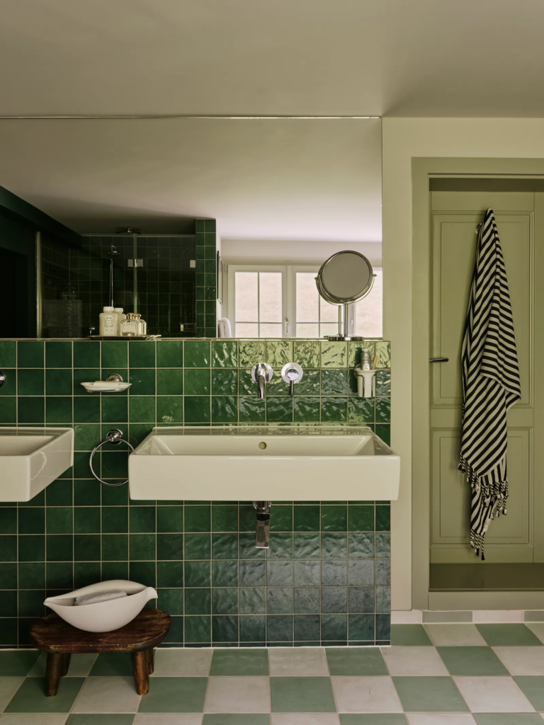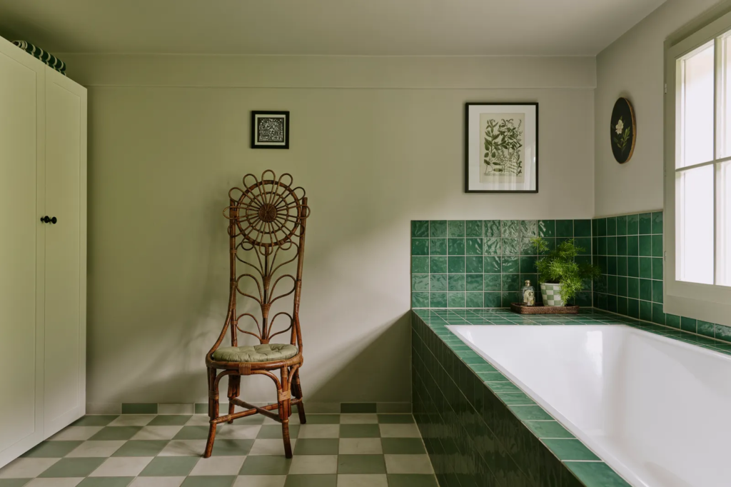 Το πράσινο πρωταγωνιστεί κυρίως στο μπάνιο, όπου τα λαμπερά σμαραγδένια πλακάκια συμπληρώνονται από ένα δάπεδο με σκακιέρα σε φασκόμηλο και λευκό. Ήταν το μόνο δωμάτιο που χρειαζόταν πλήρη ανακαίνιση λόγω μιας διαρροής. Ενσωματώνοντας τόσο προσεγμένες λεπτομέρειες στα σχέδια, συνδυάζοντας απαλά το παλιό με το νέο, η Deniz μετέτρεψε αυτόν τον άδειο καμβά στο τέλειο οικογενειακό σπίτι.