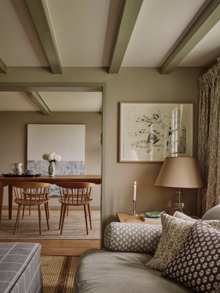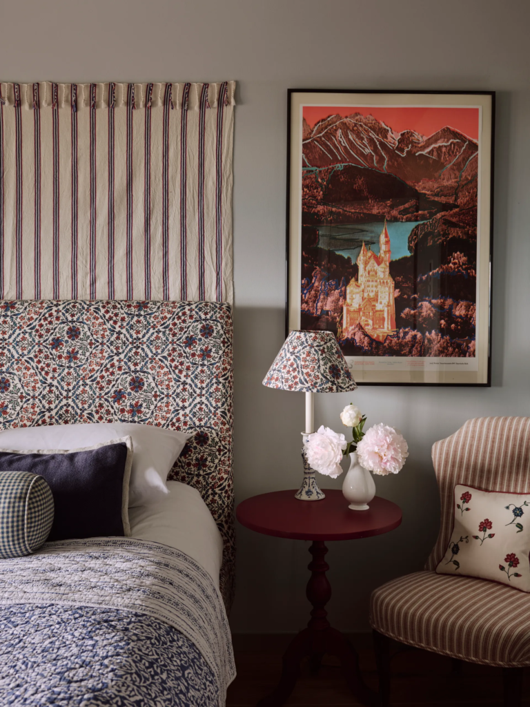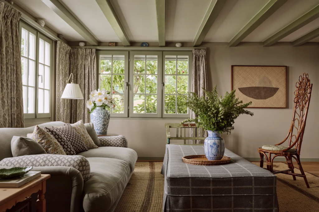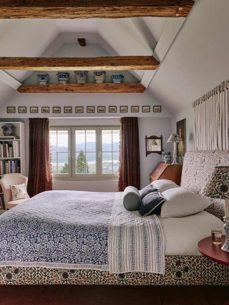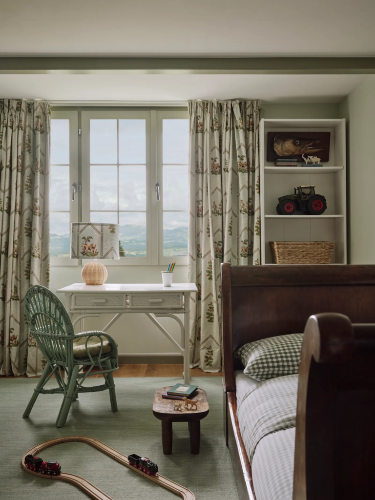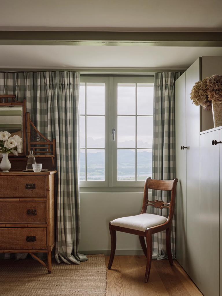 Μια κυρίως διακοσμητική προσέγγιση, δεν είναι κάτι που συνηθίζει η Deniz. «Συνήθως δεν μου αρέσει να ασχολούμαι με διακοσμητικά, οπότε ήταν λίγο δύσκολο εξαρχής» λέει. Αντί να χρησιμοποιήσει έντονο χρώμα ή μοτίβο σε μοτίβο, εισήγαγε στρώματα υφής με ένα μείγμα ξύλινων επίπλων, φυσικών υφασμάτων και υφασμάτων σε κλασικά καρό και βοτανικά prints. Με σημείο εκκίνησης τον παιδικό πάγκο, ένιωσε την έλξη να δει άλλα χειροποίητα ελβετικά και αυστριακά κομμάτια που ταιριάζουν στις μέτριες αναλογίες του αγροτόσπιτου και αντανακλούν κάτι από την ιστορία του.