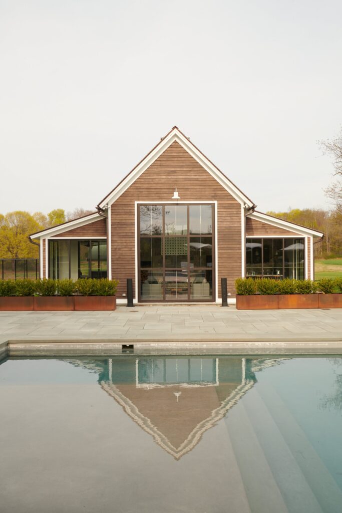 Όταν ένας νέος πελάτης της έθεσε μια τρομακτική πρόκληση – ένα κτήμα 25 στρεμμάτων στα βόρεια της Νέας Υόρκης που περιλάμβανε μια ομοσπονδιακή κατοικία του 1790 και έναν αχυρώνα του 19ου αιώνα από το θρυλικό αρχιτεκτονικό γραφείο της Χρυσής Εποχής McKim, Mead & White – η Moyler δεν έχασε ούτε στιγμή. Σχεδόν αμέσως η πελάτισσα έδωσε το δικό της twist: ο αρχιτέκτονας Ralph Mackin προσέθεσε μια μοντέρνα κατασκευή δίπλα στην πισίνα του ακινήτου. Όχι απλώς ένα σπιτάκι πισίνας αλλά ένα ολόκληρο σπίτι. Η Moyler κλήθηκε να διακοσμήσει και αυτό το κτήριο.
