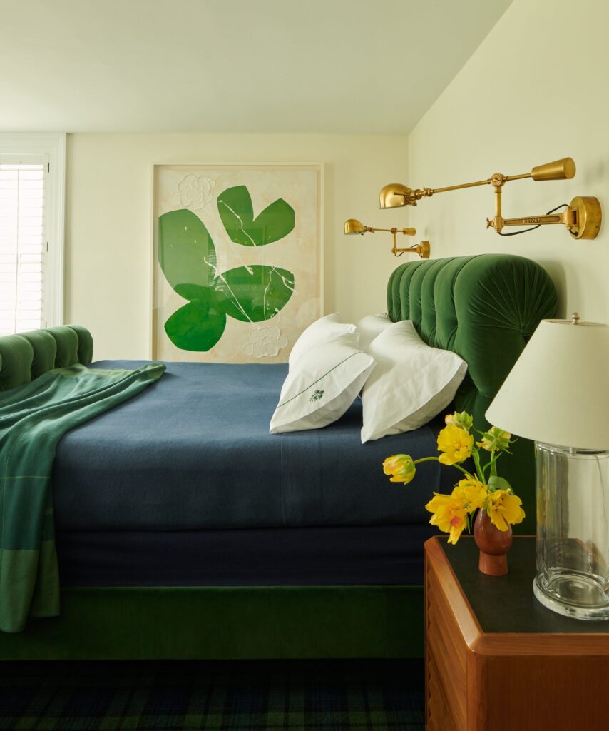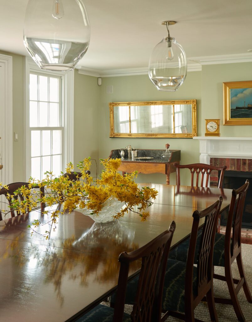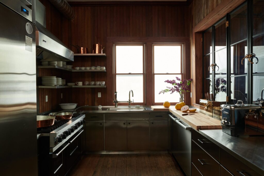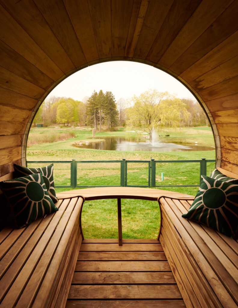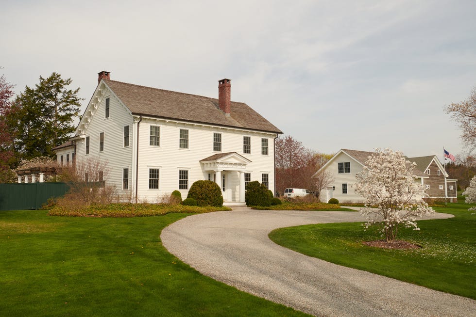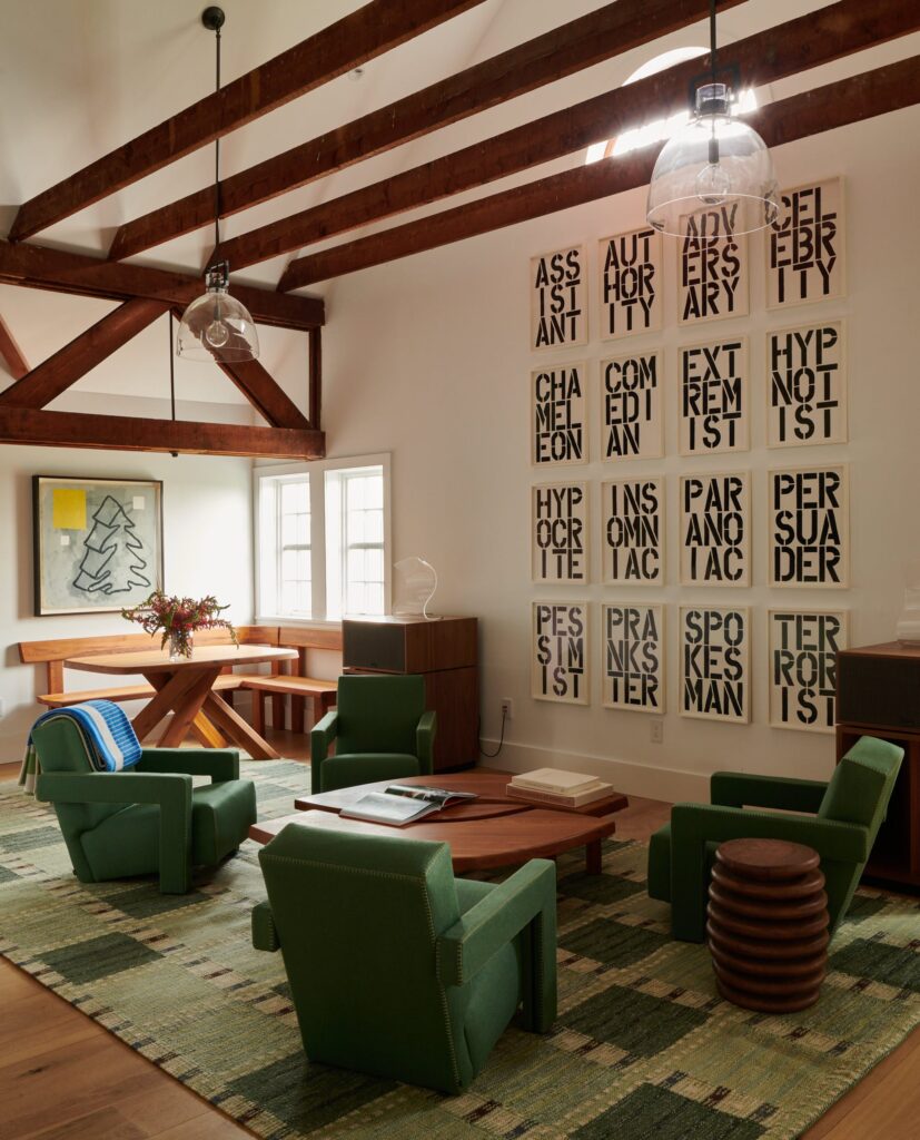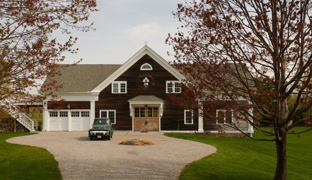 Έδωσε σε κάθε κατασκευή μια ξεχωριστή ταυτότητα. Το κυρίως σπίτι ξεχειλίζει από αντίκες και ζεστή κομψότητα, το pool house είναι ένα κομψό καταφύγιο ευεξίας με σάουνα, και ο αχυρώνας είναι χτισμένος για μεγάλες συγκεντρώσεις, περιτριγυρισμένος από λίμνες, οπωρώνες και κήπους. Υπάρχει η πισίνα, καθώς και γήπεδα (πληθυντικός), μια πίστα ποδηλασίας, ακόμη και ένας… εκτοξευτής κολοκύθας για φθινοπωρινή διασκέδαση. Η τραπεζαρία ήταν επίσης προτεραιότητα. Η Moyler δημιούργησε πέντε κουζίνες κατά παραγγελία: μια σε χρώμα φασκόμηλου στο κυρίως σπίτι, μινιμαλιστικές εσωτερικές και εξωτερικές κουζίνες στο pool house και δύο χρηστικές αλλά κομψές εγκαταστάσεις στον αχυρώνα, συμπεριλαμβανομένης μιας για την τροφοδοσία μεγάλων εκδηλώσεων.