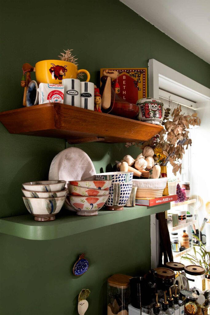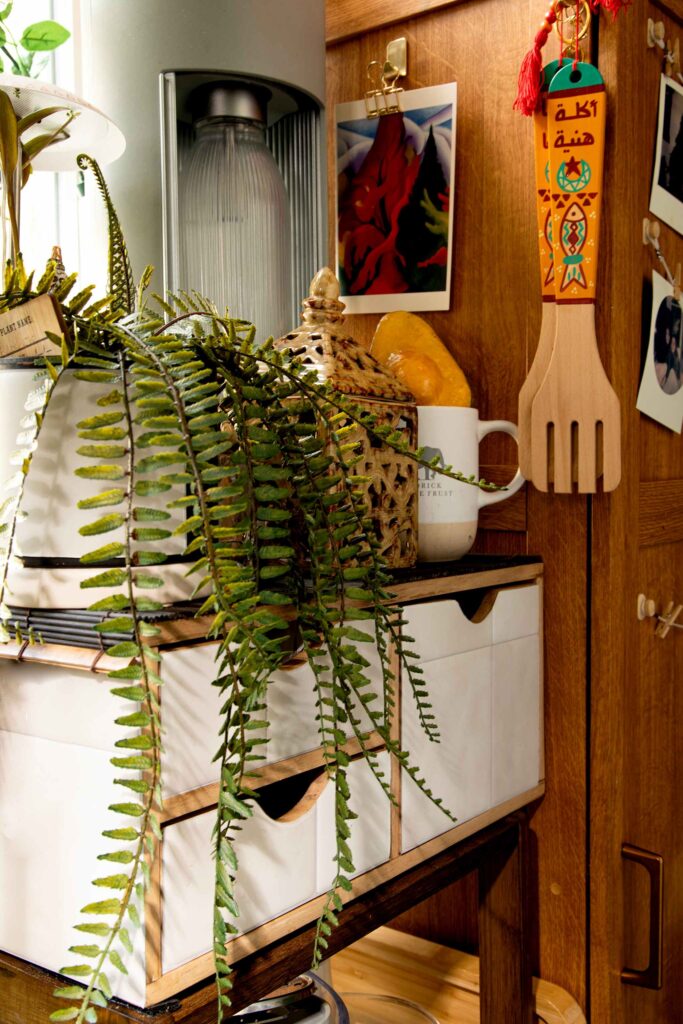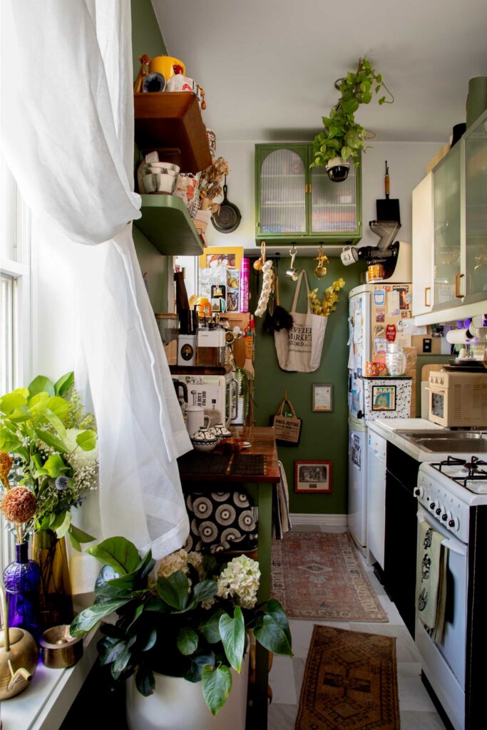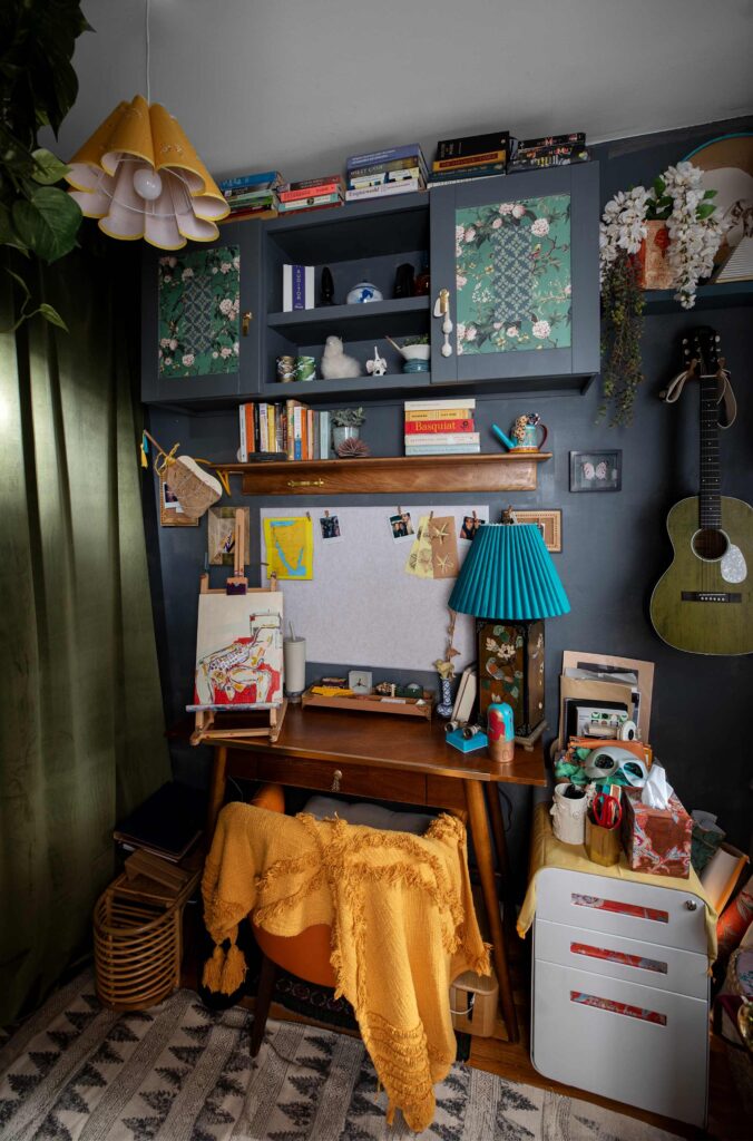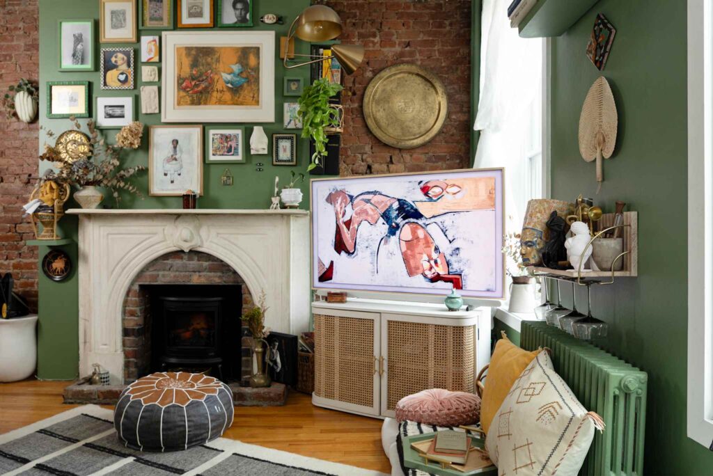 Πάνω από το τζάκι αυτό, η Rosaline δημιούργησε μια γκαλερί. Στα τέσσερα χρόνια που το ενοικιάζει, έφτιαξε ένα σπίτι σε eclectic στυλ. Μια πρόκληση στον μικρό χώρο ήταν ο αποθηκευτικός χώρος, ή η έλλειψή του, ιδιαίτερα στην κουζίνα, για την οποία λέει ότι «δεν είχε καν συρτάρι μέσα» όταν μετακόμισε. «Έχω μετατρέψει αυτό το διαμέρισμα σε Tetris. Τα έπιπλα αποθήκευσης είναι ακριβά. Το να βρω ντουλάπια, ένα island κουζίνας και ράφια που είχαν όλα τα σωστά μεγέθη και ήταν πολύ οικονομικά, και στη συνέχεια να τα ενισχύσω / προσαρμόσω ώστε να φαίνονται εντοιχισμένα, ήταν σίγουρα δύσκολο».