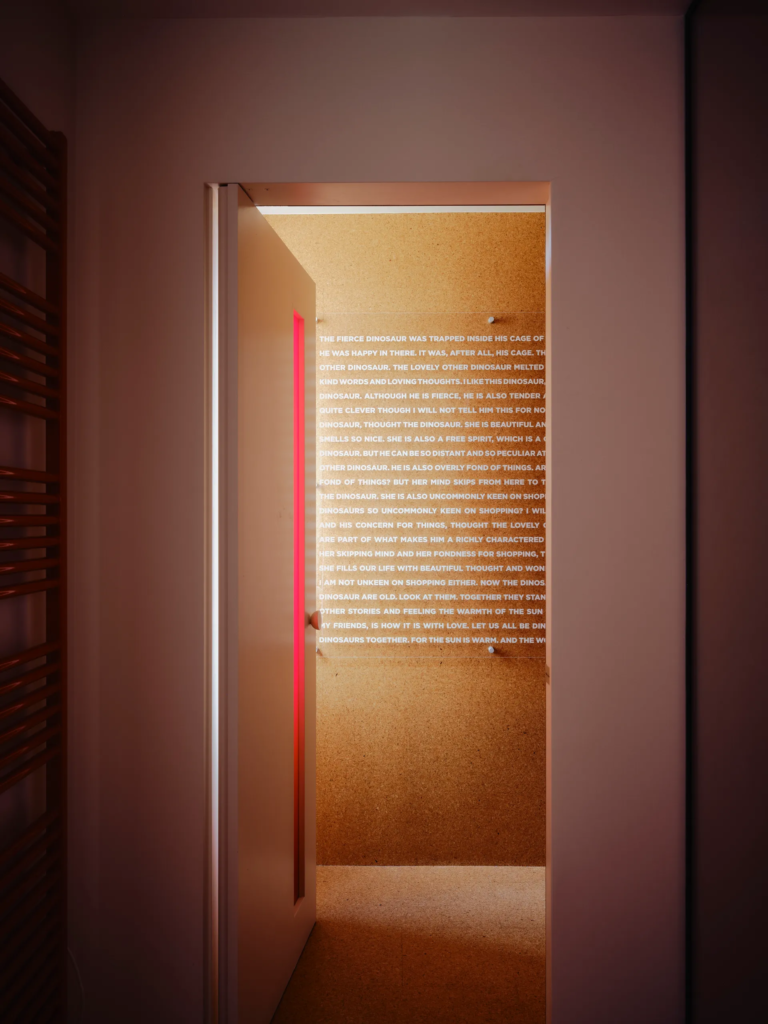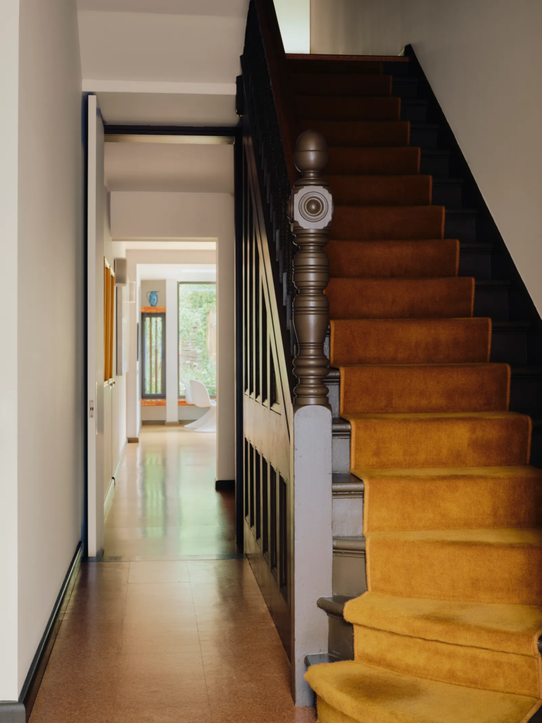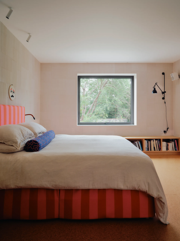 Η ίδια προσέγγιση καθοδηγεί τα υλικά σε όλη την έκταση. Δάπεδα από φελλό, βιώσιμα και επιεικής, διατρέχουν μεγάλο μέρος του ισογείου, αντιμετωπίζονται διαφορετικά σε κάθε χώρο. Πίσω από την κουζίνα υπάρχει ένα μπαρ που οδηγεί σε ένα ντουλάπι και μια πίσω πόρτα. Τα κατά παραγγελία ξύλινα έπιπλα δημιουργούν αποθηκευτικό χώρο, ενώ δίνουν ρυθμό στα δωμάτια. Η πρακτικότητα αναβαθμίζεται σε κομψότητα στο χώρο αποσκευών, όπου τα παλτά και τα παπούτσια εξαφανίζονται από το οπτικό πεδίο.