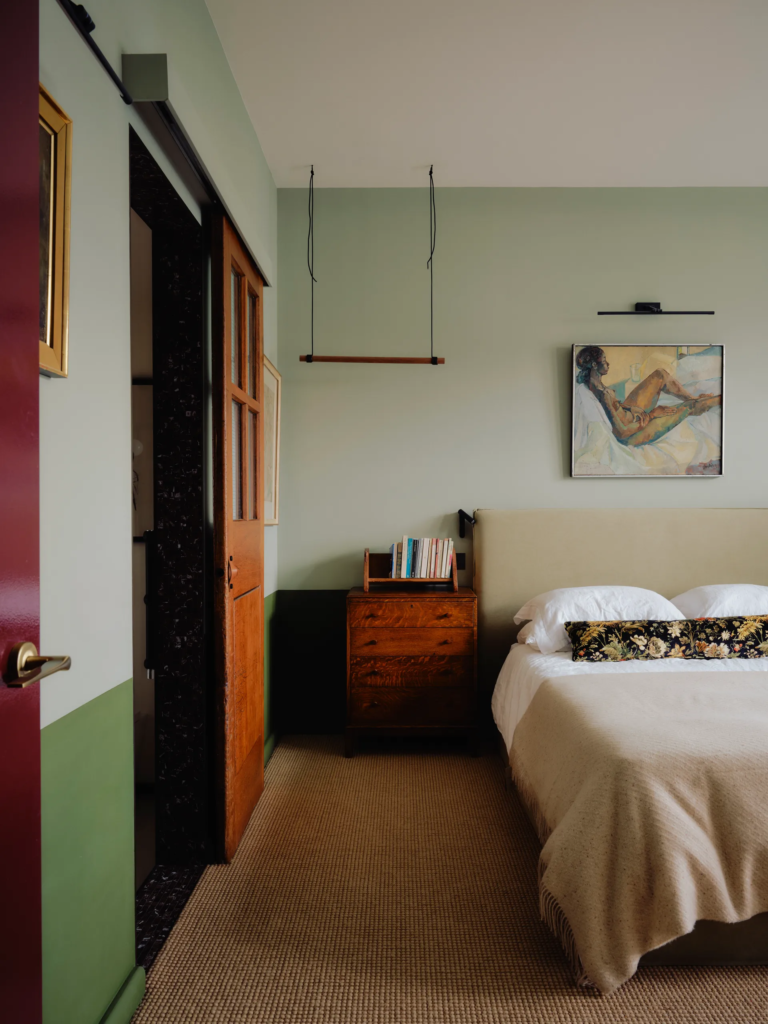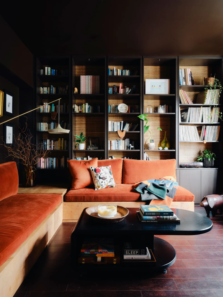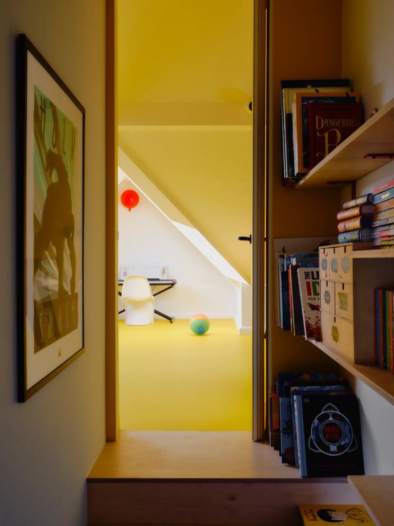 Αποκαλεί το μπροστινό καθιστικό, με βόρειο προσανατολισμό και σκόπιμα άνετο ”η φωλιά”. Εδώ, η Clare έγερνε στη σκιά, με ένα σκούρο δάπεδο από φελλό και ενσωματωμένα καθίσματα από κοτλέ που κρύβουν οικογενειακά άλμπουμ φωτογραφιών και επιτραπέζια παιχνίδια.