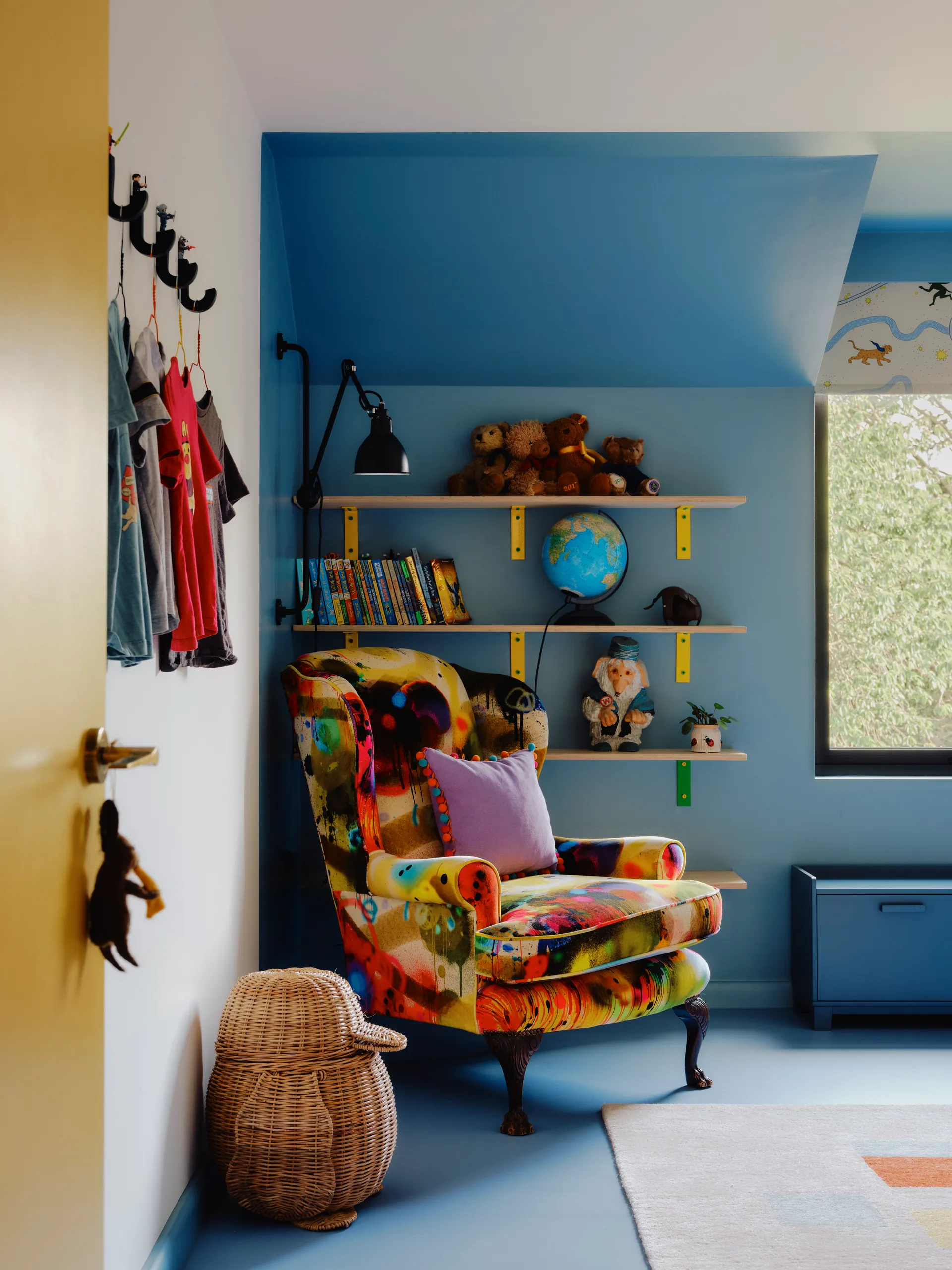 Αποκαλεί το μπροστινό καθιστικό, με βόρειο προσανατολισμό και σκόπιμα άνετο ”η φωλιά”. Εδώ, η Clare έγερνε στη σκιά, με ένα σκούρο δάπεδο από φελλό και ενσωματωμένα καθίσματα από κοτλέ που κρύβουν οικογενειακά άλμπουμ φωτογραφιών και επιτραπέζια παιχνίδια.