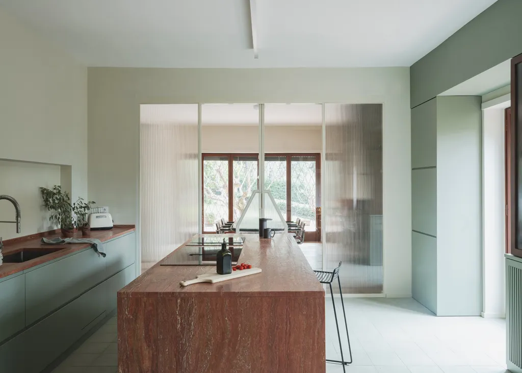 «Η τραβερτίνη πιάνει το φως όμορφα, έτσι ώστε οπουδήποτε με καλό φως ημέρας να αναδεικνύει πραγματικά τον χαρακτήρα του. Λειτουργεί εξίσου καλά σε τοίχους και δάπεδα, ή ακόμα και ως εντυπωσιακός πάγκος εργασίας ή νιπτήρας».