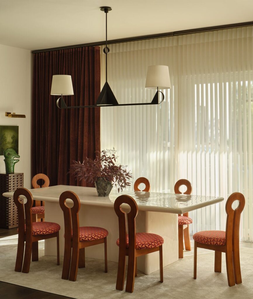 Η τραπεζαρία αλλάζει χαρακτήρα, αλλά διατηρεί το μοντέρνο νήμα με το μονοχρωματικό της σχέδιο. Ένα λευκό τραπέζι φαγητού από σκυρόδεμα βρίσκεται πάνω σε ένα απαλό, ειδικά σχεδιασμένο χαλί – ένας συνδυασμός που διατηρεί τη βάση ήρεμη και συγκεντρωμένη. «Μοιάζουν σαν κάτι που θα βλέπατε σε ένα λόμπι ξενοδοχείου, που είναι ακριβώς η στιλπνότητα που θέλαμε» λέει η Lewis.