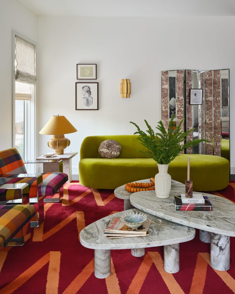 Για να εξισορροπήσει τον κορεσμό, η Lewis εφάρμοσε την πέτρα σε στρώσεις: τραπέζια από όνυχα και ένα μαρμάρινο τραπεζάκι, με τις ογκώδεις σιλουέτες τους προσθέτουν βάρος χωρίς να κατακλύζουν το δωμάτιο. Ένα ζευγάρι vintage πολυθρόνες με ταπετσαρία με ένα έντονο καρό πορτοκαλί, φούξια, μουσταρδί και μπλε φέρνει ενέργεια και στυλ.