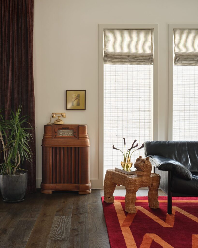 Στο σαλόνι, το χρώμα στήνει το σκηνικό. Ένας βελούδινος καναπές chartreuse δίνει μια δυναμική πινελιά: «Είναι ζωντανός, λίγο της δεκαετίας του ’70, αλλά με έναν φουτουριστικό τρόπο» λέει η Lewis, ενώ ένα μπορντό χαλί με ένα δυναμικό μοτίβο «σε τραβάει υποσυνείδητα στον χώρο». Ως αντίστιξη, ένας πολυχρησιμοποιημένος ιταλικός δερμάτινος καναπές αγκυροβολεί το δωμάτιο με το είδος της άνεσης που καθόριζε τον μοντερνισμό της δεκαετίας του 1970.
