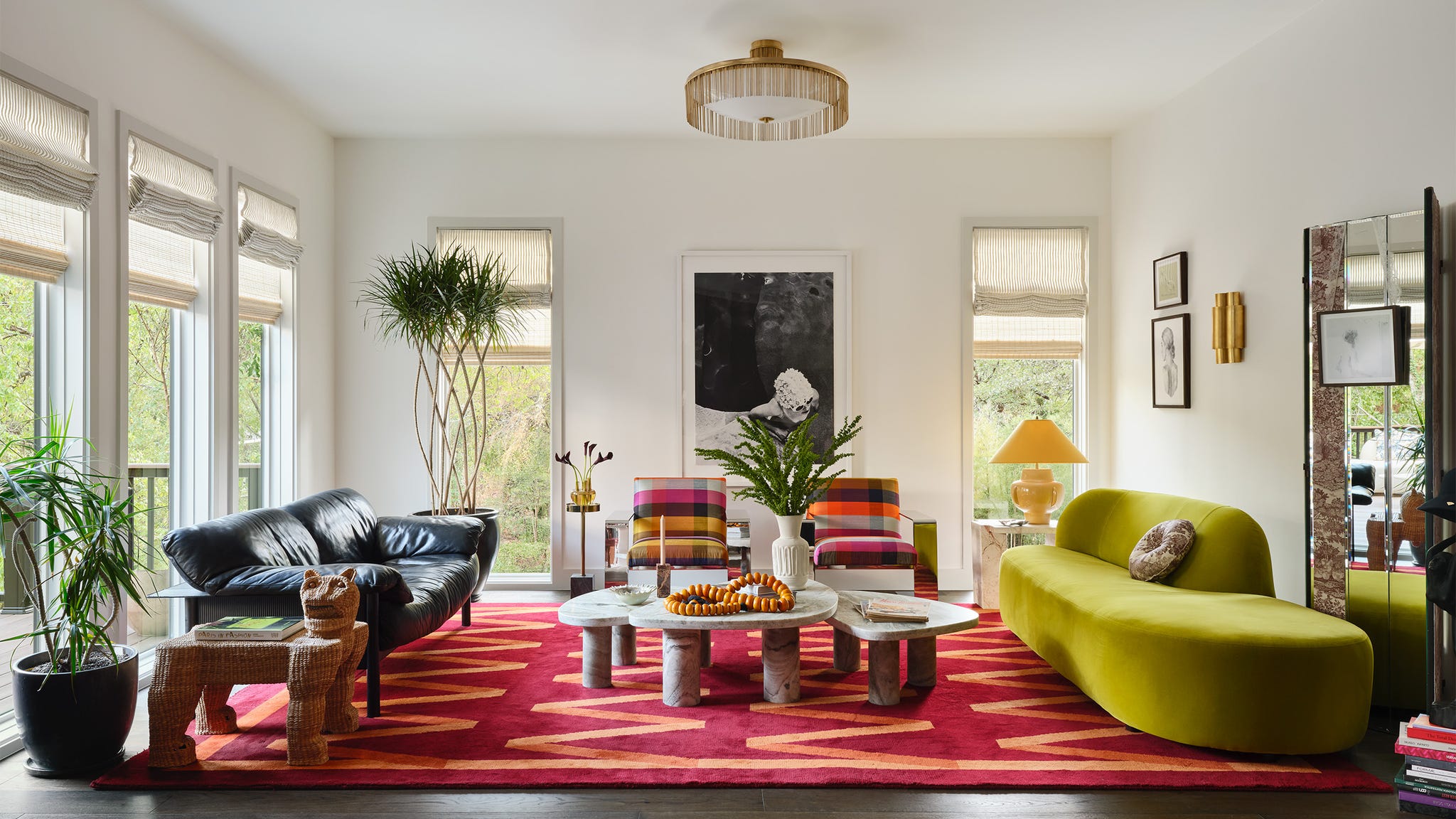 Στο σαλόνι, το χρώμα στήνει το σκηνικό. Ένας βελούδινος καναπές chartreuse δίνει μια δυναμική πινελιά: «Είναι ζωντανός, λίγο της δεκαετίας του ’70, αλλά με έναν φουτουριστικό τρόπο» λέει η Lewis, ενώ ένα μπορντό χαλί με ένα δυναμικό μοτίβο «σε τραβάει υποσυνείδητα στον χώρο». Ως αντίστιξη, ένας πολυχρησιμοποιημένος ιταλικός δερμάτινος καναπές αγκυροβολεί το δωμάτιο με το είδος της άνεσης που καθόριζε τον μοντερνισμό της δεκαετίας του 1970.