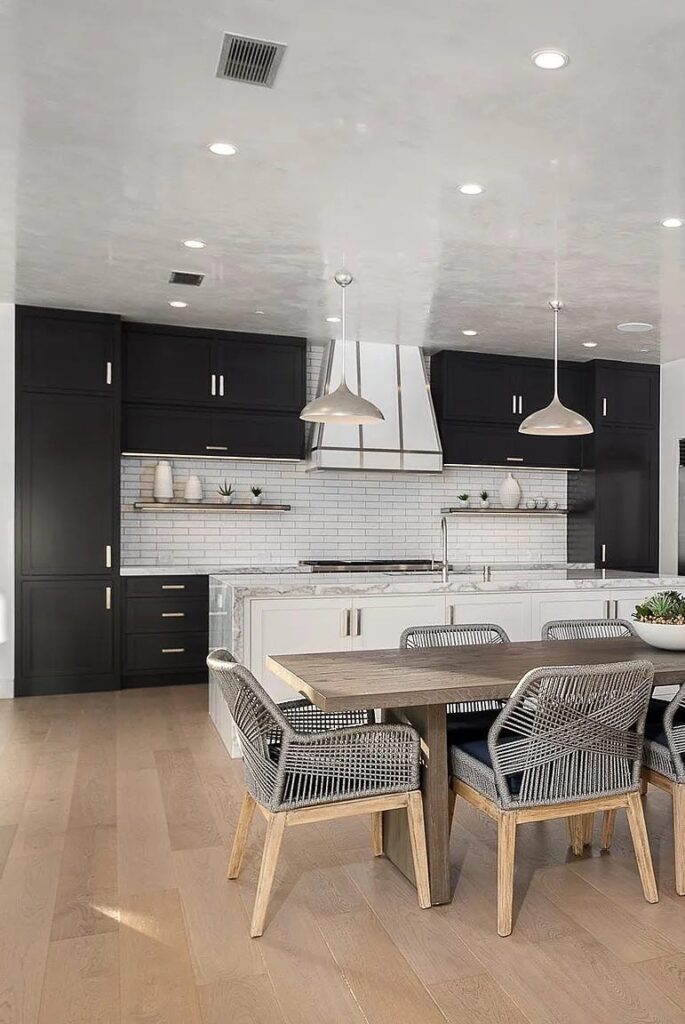 Στο ”πριν”, κυριαρχούν οι αντιθέσεις του λευκού και του μαύρου, με μαύρα ντουλάπια και λευκά πλακάκια τύπου subway στον τοίχο. Ο πάγκος και το island της κουζίνας είναι επίσης λευκά με μαρμάρινη όψη, ενώ οι μεταλλικές καρέκλες με ξύλινα πόδια και ψάθινη πλάτη δίνουν μια πιο «ζεστή», casual αίσθηση. Ο φωτισμός αποτελείται από κλασικά λευκά μεταλλικά φωτιστικά οροφής, τα οποία ενισχύουν τη φωτεινότητα του χώρου. Η γενική εντύπωση είναι λειτουργική, αλλά σχετικά απλή και περισσότερο προσανατολισμένη σε μια καθαρή, οικογενειακή αισθητική.