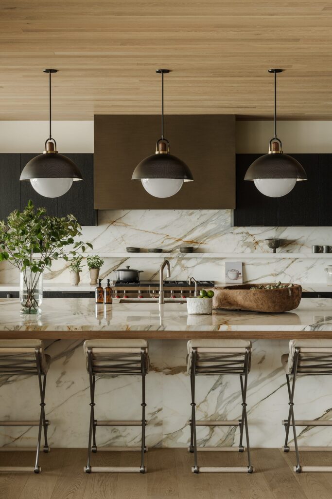 Ολόκληρος ο χώρος έχει «ζεσταθεί» αισθητικά μέσω των υλικών: το λευκό μάρμαρο με χρυσές φλέβες καλύπτει όχι μόνο τον πάγκο αλλά και τον τοίχο, δημιουργώντας μια εντυπωσιακή συνέχεια. Τα ντουλάπια έχουν πιο σκούρο, ματ φινίρισμα, ενώ το ταβάνι επενδύεται με ξύλο, προσδίδοντας φυσική υφή και βάθος. Τα νέα φωτιστικά είναι μοντέρνα, με μεταλλικό φινίρισμα και σφαιρικούς λαμπτήρες, συμβάλλοντας σε μια αίσθηση πολυτέλειας. Οι καρέκλες μπαρ από μέταλλο αντικαθιστούν τις παλαιότερες, ενισχύοντας τη μοντέρνα, καθαρή γραμμή του χώρου.
