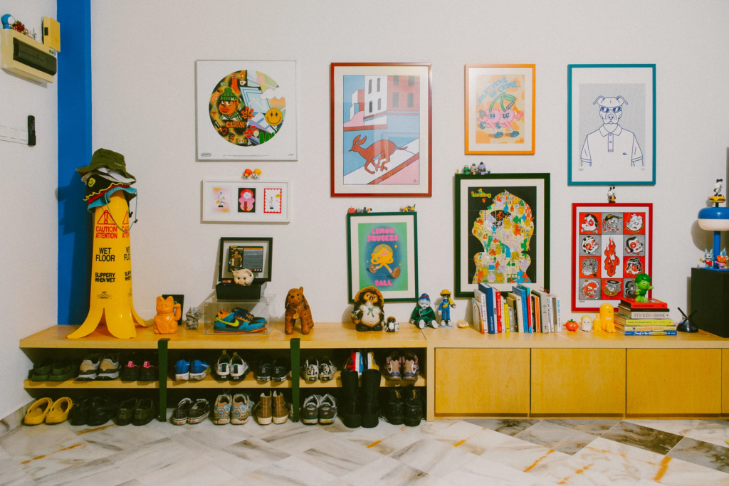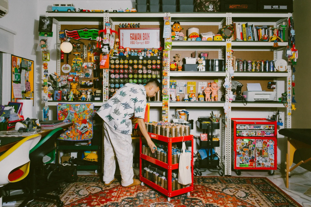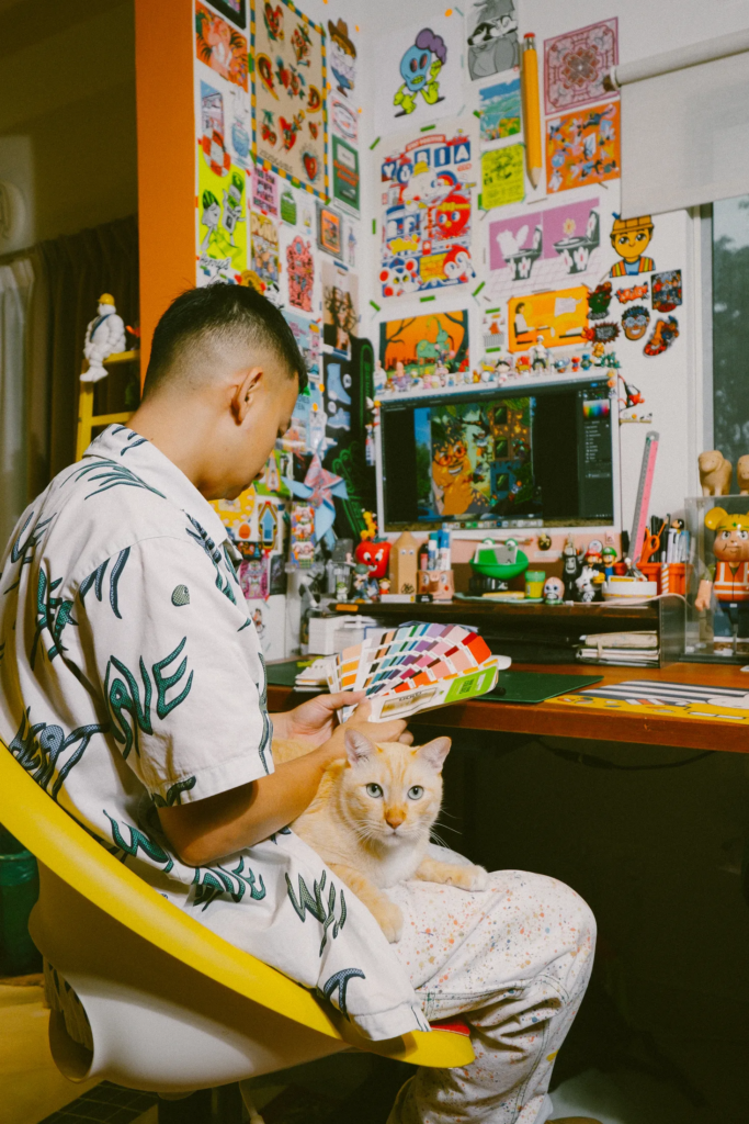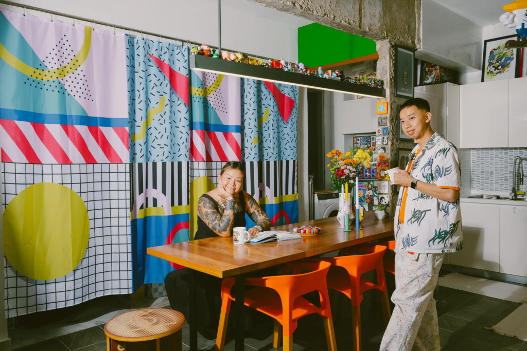 Το σπίτι που μοιράζεται με τη σύντροφό του, Zoe – μια συνάδελφο εικονογράφο, σχεδιάστρια και καλλιτέχνη τατουάζ – είναι ένα χαρούμενο, γεμάτο χρώματα καταφύγιο. Μαζί, έχουν ανακαινίσει ένα τυπικό μαλαισιανό διαμέρισμα – «απλώς ένα ορθογώνιο» όπως λέει – σε έναν ζεστό, λειτουργικό χώρο διαβίωσης και εργασίας. Οι τοίχοι αφαιρέθηκαν για να ανοίξει η κουζίνα και το στούντιο, και οι λύσεις αποθήκευσης σχεδιάστηκαν για να ταιριάζουν στις δημιουργικές συνήθειες του ζευγαριού. «Η εσωτερική διακόσμηση είναι κι αυτή τέχνη» λέει. «Πρέπει να ξέρεις πώς να αποθηκεύεις τα πράγματα σωστά». Η ανοιχτή αποθήκευση που επέλεξαν σημαίνει ότι όλα είναι εκτεθειμένα, αλλά το αποτέλεσμα είναι επιμελημένο, όχι χαοτικό.