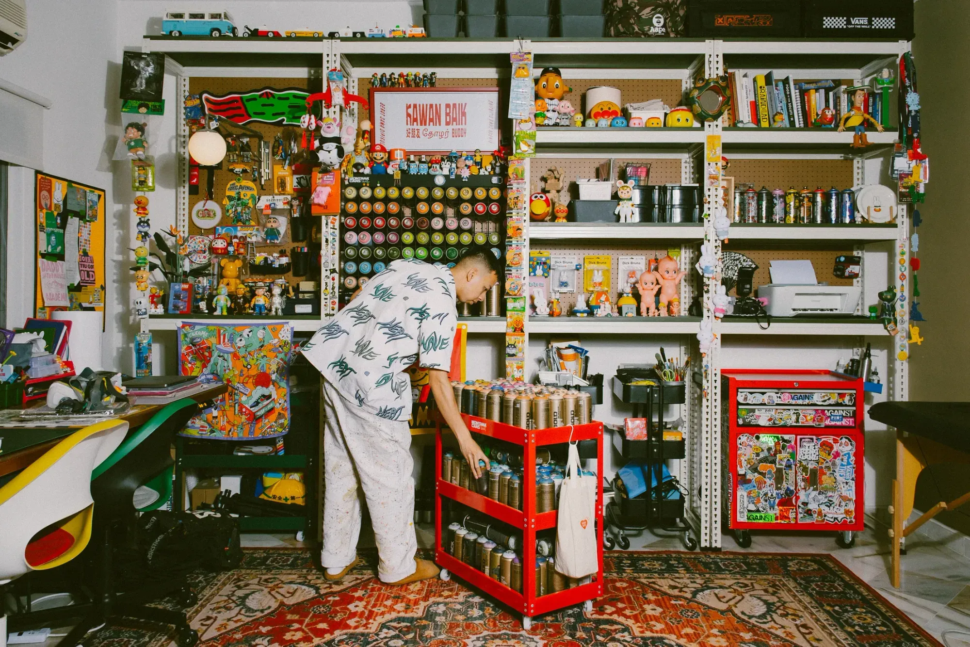 Το αγαπημένο του σημείο στο σπίτι είναι το στούντιο. Αν και ανοίγει στο σαλόνι, ένα περσικό χαλί στον χώρο του στούντιο σηματοδοτεί το όριο. Λευκά μεταλλικά ράφια πλαισιώνουν έναν τοίχο, διακοσμημένο με έντονα ιαπωνικά πακέτα σνακ, ρετρό αυτοκινητάκια και χαρακτήρες όπως ο Μπομπ ο Μάστορας, ο Μάριο, ο Woody από το Toy Story και ο Cloaky – η συλλεκτική φιγούρα του Chern. Ένας πίνακας ανακοινώσεων ξεχειλίζει από καρτ ποστάλ και φυλλάδια συναυλιών, και ένας χώρος είναι αφιερωμένος σε σπρέι σε κάθε δυνατό χρώμα.