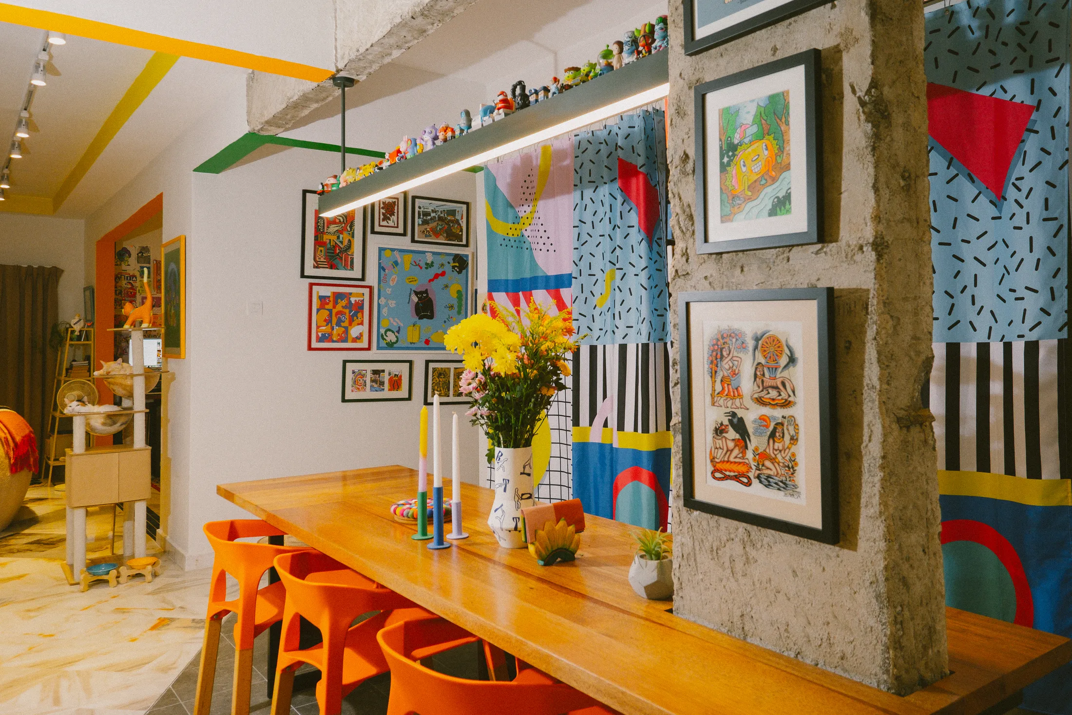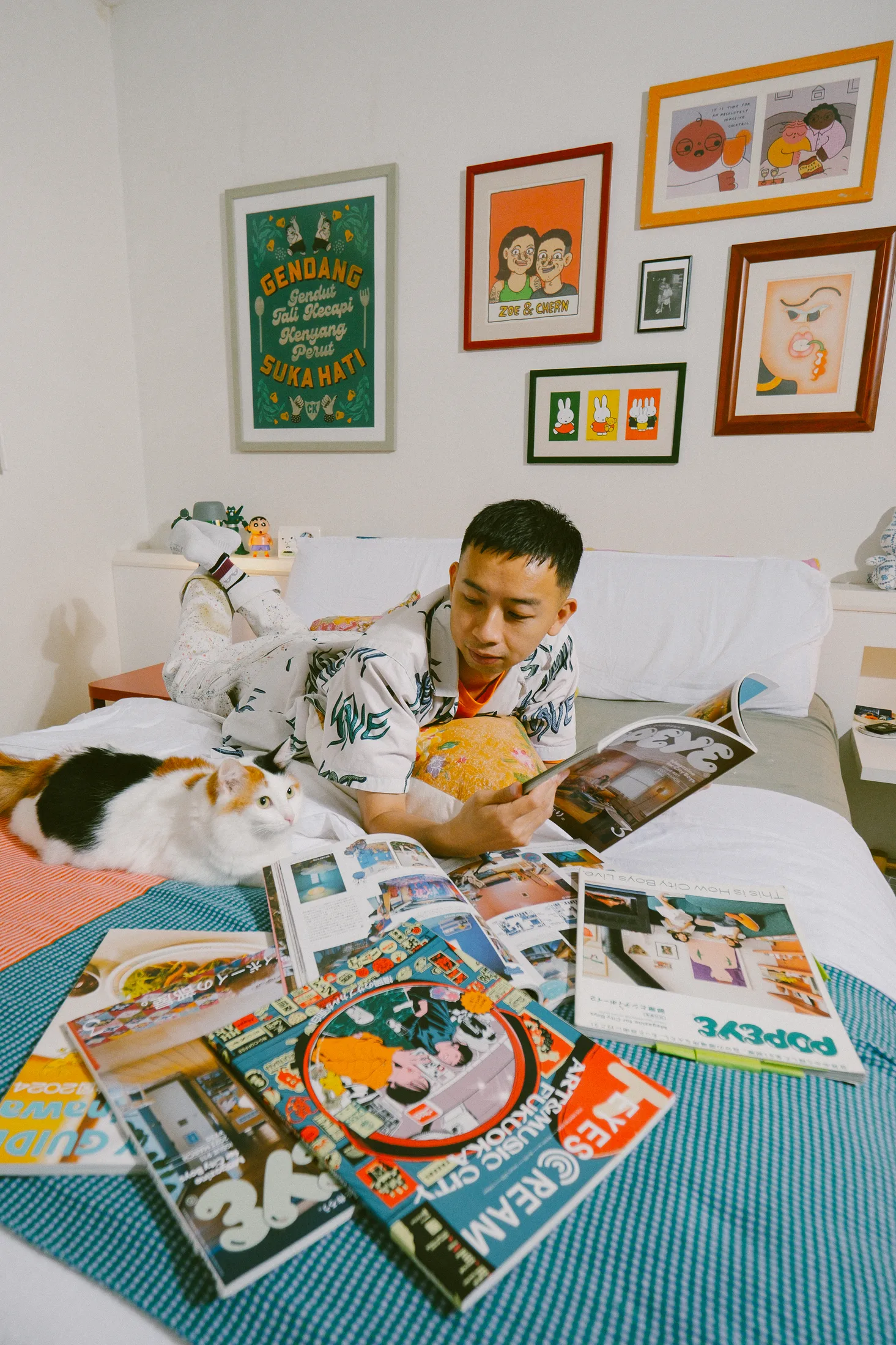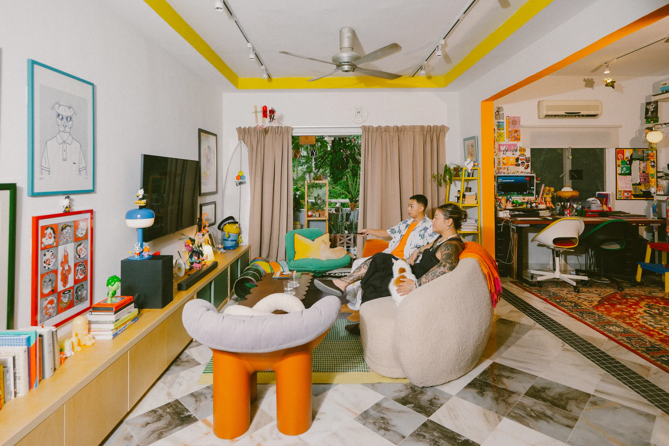 Το σπίτι που μοιράζεται με τη σύντροφό του, Zoe – μια συνάδελφο εικονογράφο, σχεδιάστρια και καλλιτέχνη τατουάζ – είναι ένα χαρούμενο, γεμάτο χρώματα καταφύγιο. Μαζί, έχουν ανακαινίσει ένα τυπικό μαλαισιανό διαμέρισμα – «απλώς ένα ορθογώνιο» όπως λέει – σε έναν ζεστό, λειτουργικό χώρο διαβίωσης και εργασίας. Οι τοίχοι αφαιρέθηκαν για να ανοίξει η κουζίνα και το στούντιο, και οι λύσεις αποθήκευσης σχεδιάστηκαν για να ταιριάζουν στις δημιουργικές συνήθειες του ζευγαριού. «Η εσωτερική διακόσμηση είναι κι αυτή τέχνη» λέει. «Πρέπει να ξέρεις πώς να αποθηκεύεις τα πράγματα σωστά». Η ανοιχτή αποθήκευση που επέλεξαν σημαίνει ότι όλα είναι εκτεθειμένα, αλλά το αποτέλεσμα είναι επιμελημένο, όχι χαοτικό.