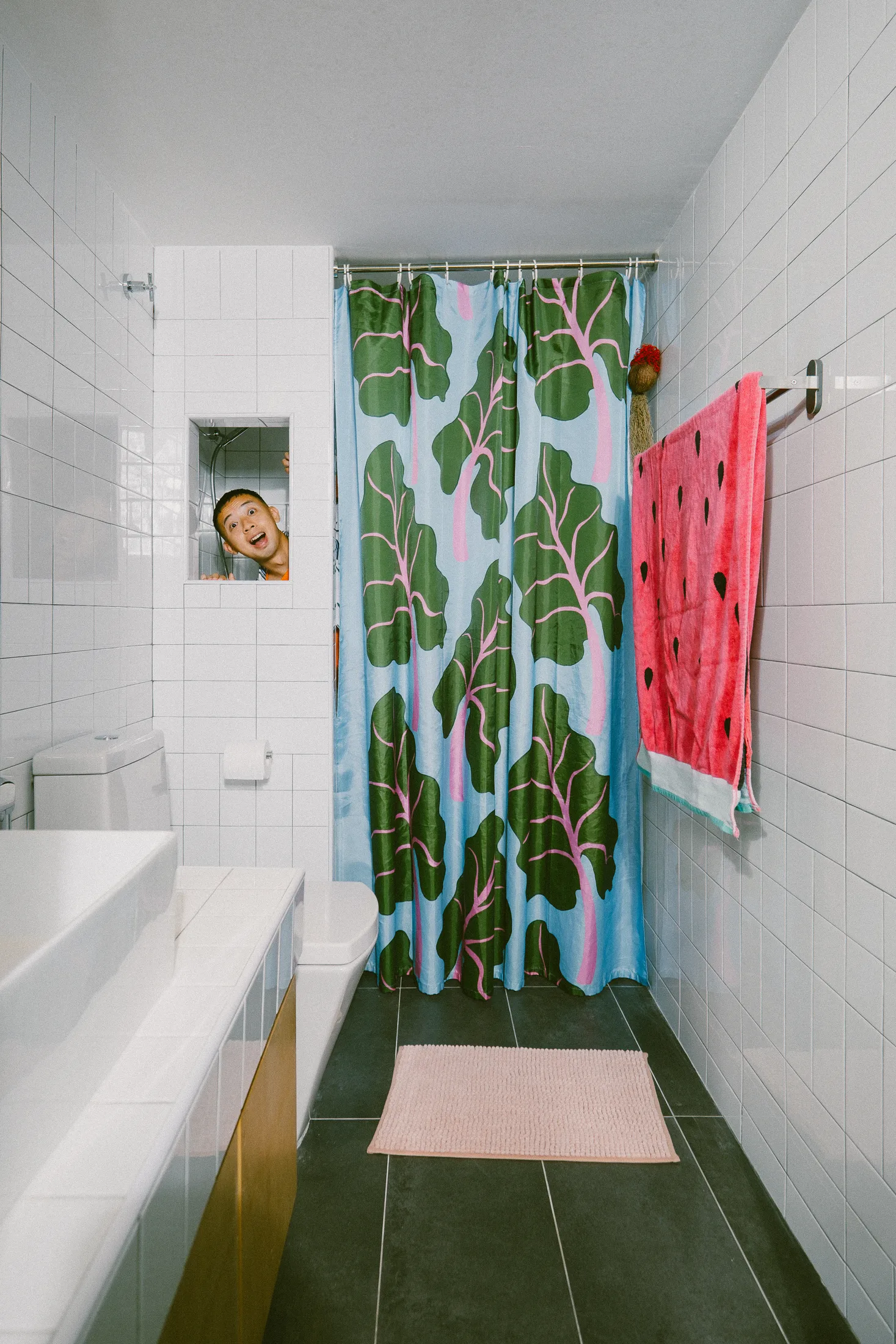Σε όλο το σπίτι τους υπάρχουν παιχνιδιάρικα, συναισθηματικά αντικείμενα: εκτυπώσεις τέχνης, βιβλία σχεδίασης, μπλοκ σχεδίασης και μια γιγάντια ροζ λαστιχένια πάπια που βρέθηκε σε μια υπαίθρια αγορά στο Παρίσι και τώρα βρίσκεται στο μπάνιο, έναν από τους λίγους λευκούς χώρους στο σπίτι. «Μας ελκύει το χρώμα» χαμογελάει. «Όχι οι μάρκες. Απλώς ό,τι μας κάνει ευτυχισμένους».