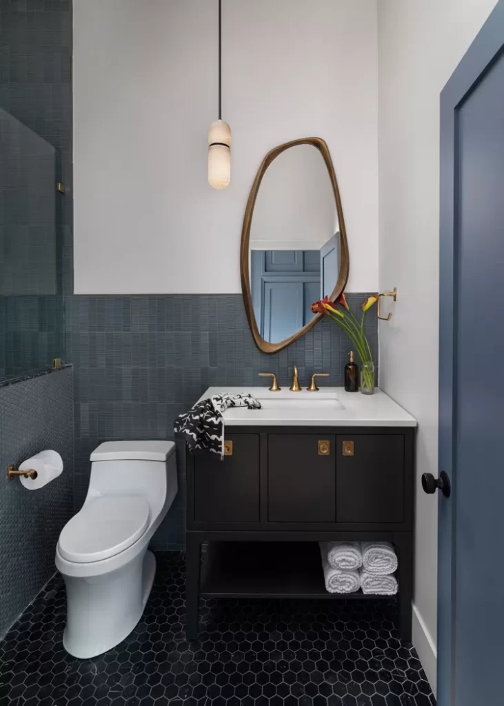 Συγκεκριμένα, η Lynch απολαμβάνει να επεκτείνει τα πλακάκια προς τα πάνω σε ένα κορεσμένο χρώμα. «Τα πλακάκια μέχρι την οροφή βοηθούν το μάτι να συνεχίσει να κοιτάζει προς τα πάνω, όπως ακριβώς κάνει ένα χρώμα βαφής σε ένα δωμάτιο» εξηγεί η Lynch. «Δεν χρειάζεται να έχετε ένα λευκό μπάνιο μόνο και μόνο επειδή είναι μικρό. Μην φοβάστε να επιλέξετε μια πιο τονική εμφάνιση».