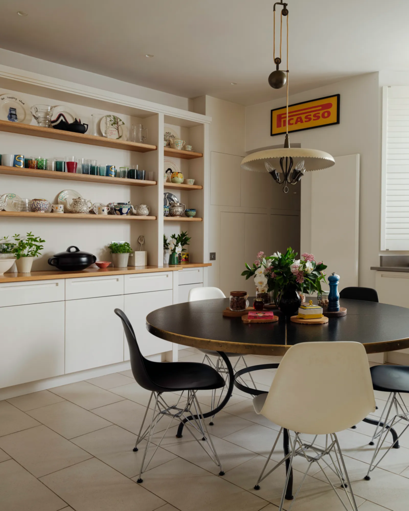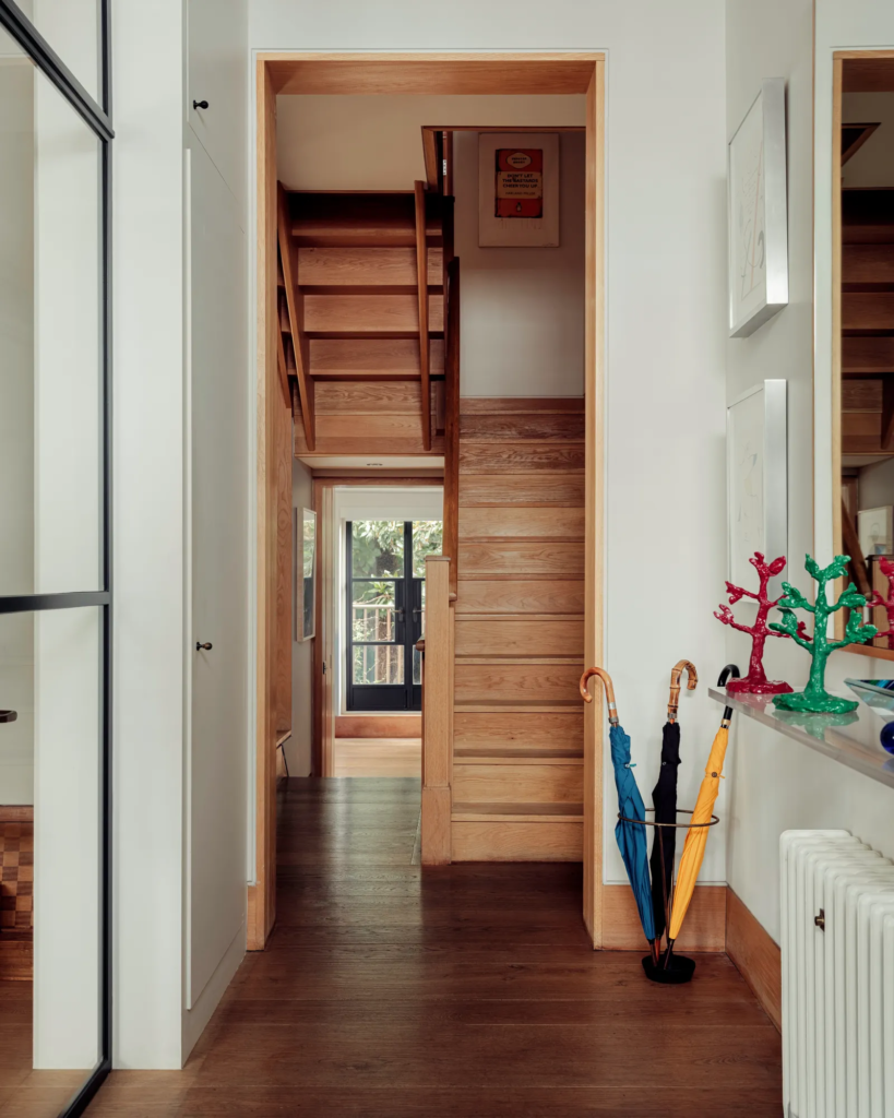 Το εσωτερικό του σπιτιού ήταν ήδη όμορφο. Ένας απέραντος φωταγωγός εκτείνεται από το υπόγειο μέχρι το ισόγειο, με εσωτερικά παράθυρα από το μπροστινό σαλόνι και το διάδρομο με θέα σε μια τραπεζαρία διπλού ύψους από κάτω, όπου κρέμεται στον τοίχο ένας τεράστιος πίνακας. Η πραγματική πρόκληση ήταν ότι «ήταν σαν ένα σπίτι εργένηδων όταν το αγόρασα και μετά έπρεπε να το μετατρέψω σε οικογενειακό σπίτι».