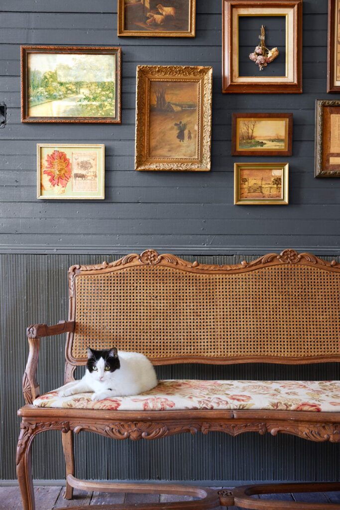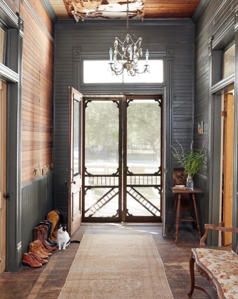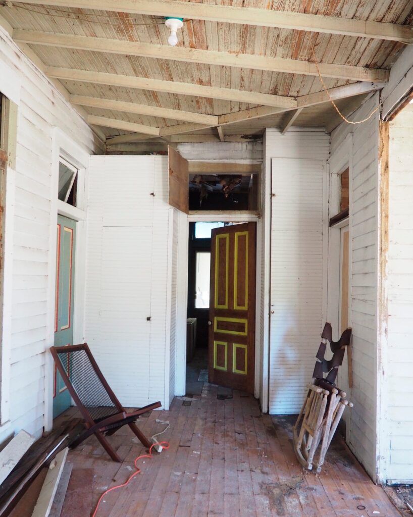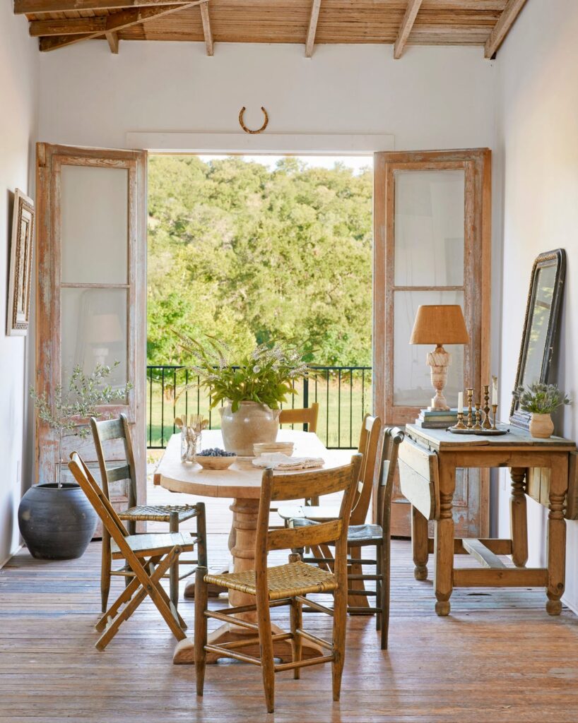 Το πίσω μέρος του σπιτιού, που κάποτε ήταν επενδυμένο με σανίδες, οδηγεί σε μια νέα βεράντα με άνοιγμα με διπλή πόρτα που αντικατοπτρίζει την μπροστινή είσοδο. «Μου άρεσε η ιδέα ότι, όταν μπαίνατε στο σπίτι, μπορούσατε να δείτε μέχρι έξω» λέει η Claire. Το δωμάτιο είναι απλά επιπλωμένο με ένα τραπέζι και μια συλλογή από αταίριαστες καρέκλες με υφαντά καθίσματα που πωλούνται στην τιμή των 10 δολαρίων η καθεμία στο Facebook Marketplace.