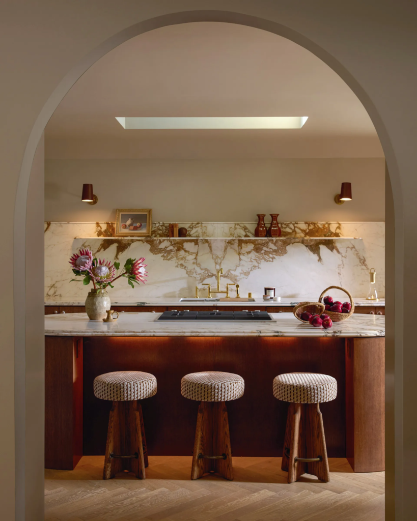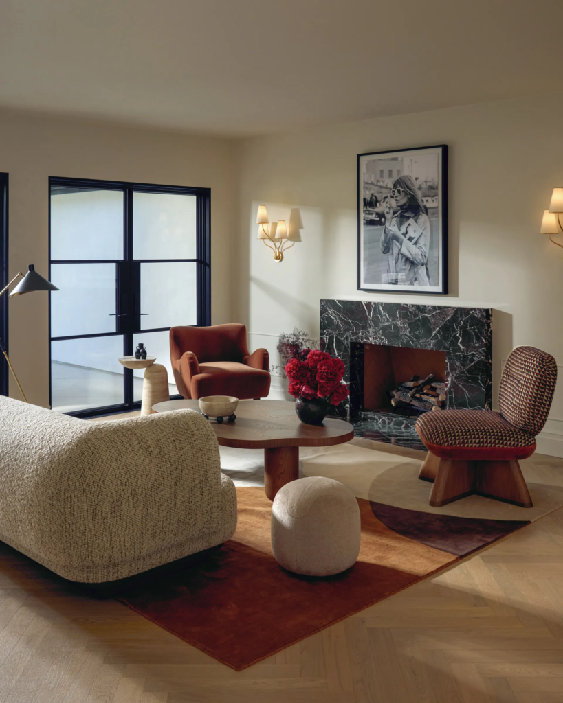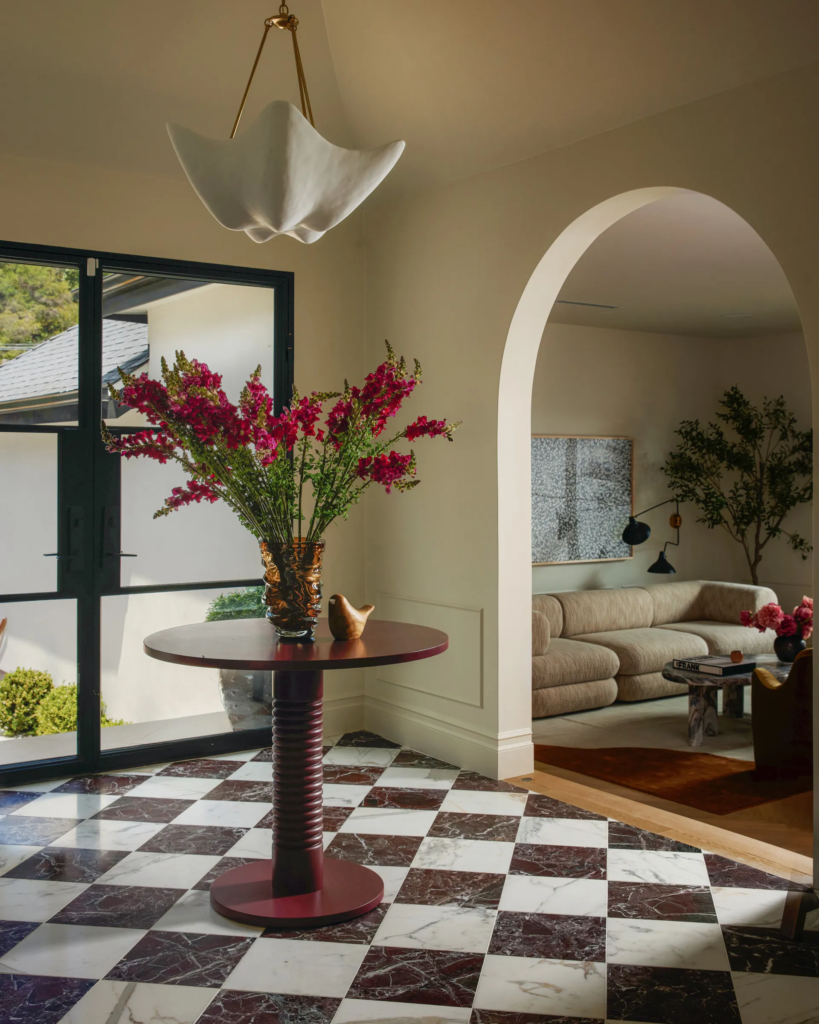 Ξεκίνησε δημιουργώντας ένα φουαγιέ, αφού αρχικά άνοιγε απότομα στον χώρο διαβίωσης, και κατ’ επέκταση μια νέα ”πρώτη εντύπωση”. Με μαρμάρινα πλακάκια σκακιέρα και τοξωτές πόρτες, δίνει στους επισκέπτες μια γεύση από το τι πρόκειται να ακολουθήσει. «Θέλαμε λίγο κασμίρ. Θέλαμε μοχέρ. Θέλαμε πολύ μάρμαρο. Θέλαμε ορείχαλκο. Θέλαμε διακοσμητικά στοιχεία» λέει η Νίνα. «Θέλαμε πράγματα που πραγματικά αναβαθμίζουν έναν χώρο».
