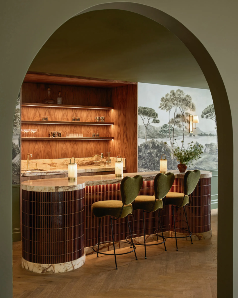 Η Nina μπορούσε να φανταστεί τις κομψές συγκεντρώσεις: προβολές στο projector room, κοκτέιλ στο μπαρ με επένδυση καρυδιάς, ίσως μια βουτιά αργά το βράδυ στην πισίνα… Ήταν, και παραμένει, ένα μοντέρνο σπίτι χτισμένο για να ψυχαγωγεί κόσμο. Η αίθουσα του μπαρ, μεγαλύτερη ακόμη και από το κυρίως υπνοδωμάτιο ή την κουζίνα, ήταν η πεμπτουσία του χαρακτήρα του, ενώ αναβάθμιζε κάθε εκατοστό με εκλεκτά υλικά και διακοσμητικά στοιχεία.