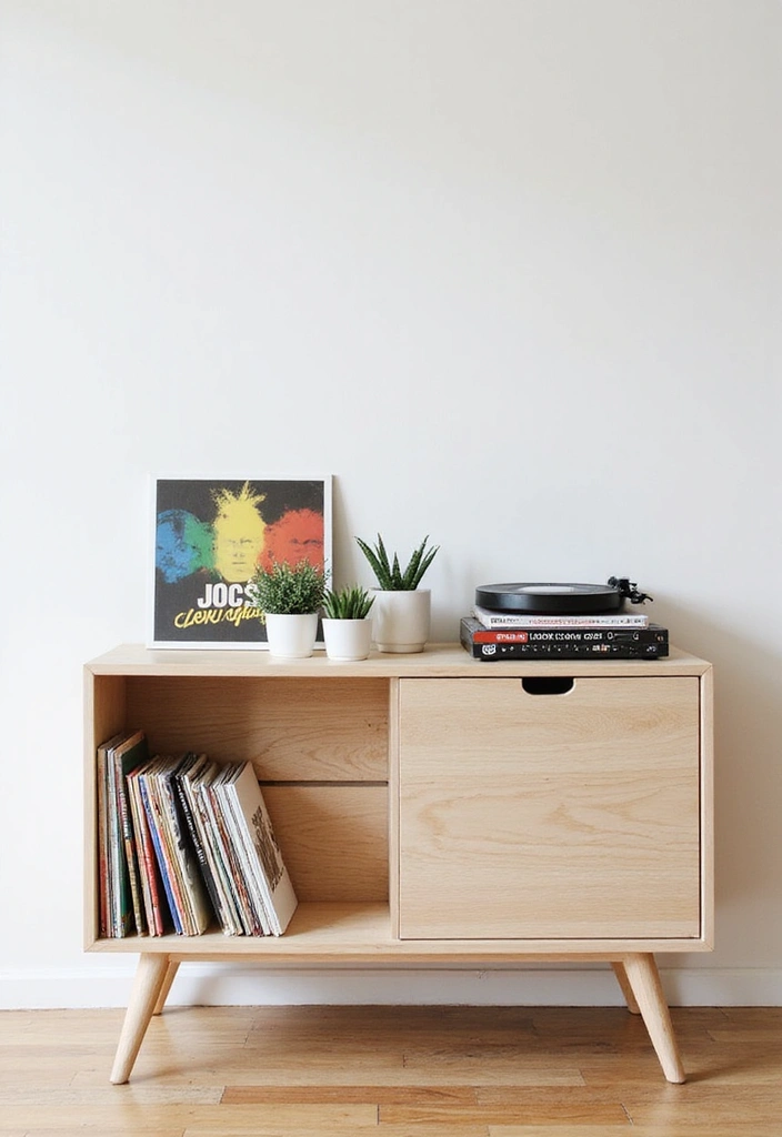 Χρησιμοποιήστε ράφια αποθήκευσης δίσκων βινυλίου για να τακτοποιήσετε τα αγαπημένα σας άλμπουμ, παρουσιάζοντας τα ζωηρά εξώφυλλά τους για να τα θαυμάσουν όλοι. Ενσωματώστε μερικά διακοσμητικά στοιχεία όπως διακοσμητικά παχύφυτα ή μινιμαλιστικά κεριά για να προσθέσετε μια πινελιά προσωπικότητας και να σπάσετε τη γραμμικότητα των άλμπουμ.