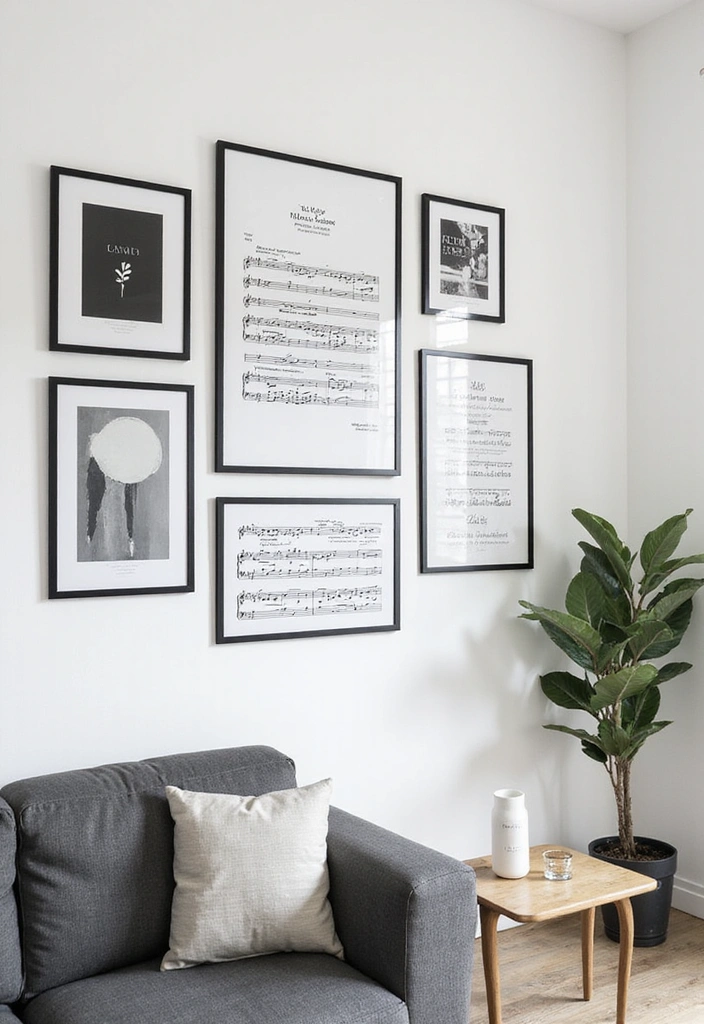 Σκεφτείτε να ενσωματώσετε παρτιτούρες, αφηρημένες εκτυπώσεις μουσικής, αγαπημένα εξώφυλλα δίσκων ή αφίσες που αντανακλούν τα γούστα σας. Επιλέξτε μονόχρωμα ή απαλά χρώματα για να διατηρήσετε μια καθαρή και γαλήνια αισθητική, διασφαλίζοντας ότι η τέχνη αναδεικνύει αντί να κατακλύζει τον χώρο σας. Ένα μοναδικό έργο μπορεί να γίνει ένα εντυπωσιακό σημείο εστίασης, ενώ ένας επιμελημένος τοίχος γκαλερί με μικρότερα έργα δημιουργεί μια υποβλητική αφήγηση του μουσικού σας ταξιδιού.