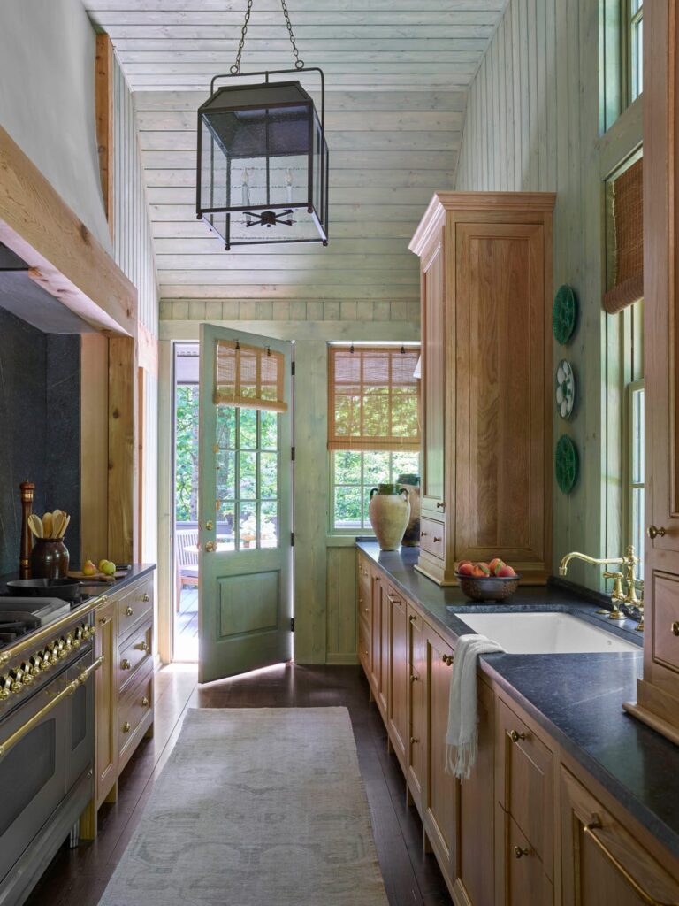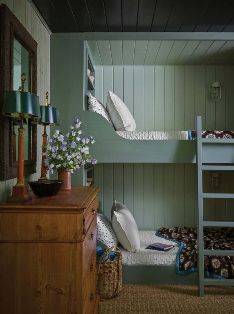 Η ανορθόδοξη, ολοπράσινη και διαχρονική προσέγγιση της Gilbreath δεν ήταν η μόνη τολμηρή απόφαση που πήρε. Επέκτεινε επίσης την πέτρινη επιφάνεια γύρω από το τζάκι του καθιστικού, πρόσθεσε μια βεράντα και ένα δωμάτιο με κουκέτες και, με τη βοήθεια του αρχιτέκτονα David Baker, μετέτρεψε την «παλιομοδίτικη» κουζίνα σε πλυσταριό, μπαρ και μπάνιο.