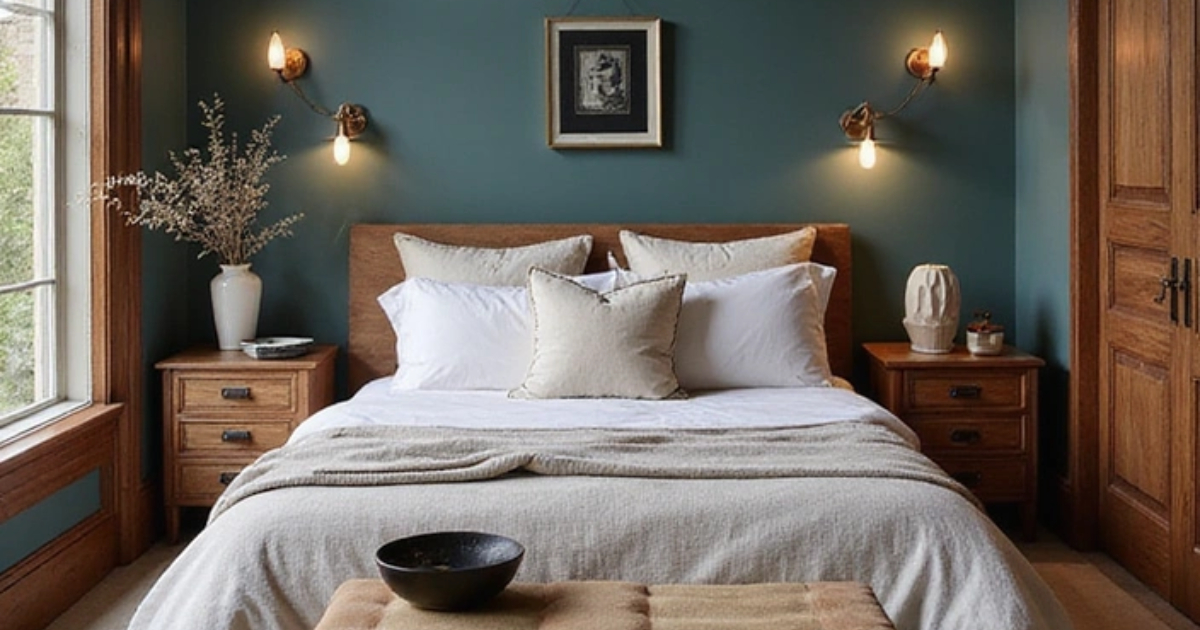 Αυτό το βαθύ teal είναι υπέροχη επιλογή για κρεβατοκάμαρα γιατί φτιάχνει ατμόσφαιρα. Συνδυασμένο με το ξύλο, προσφέρουν κομψότητα χωρίς υπερβολή και κάνουν τον χώρο να δείχνει πραγματικά ζεστός.