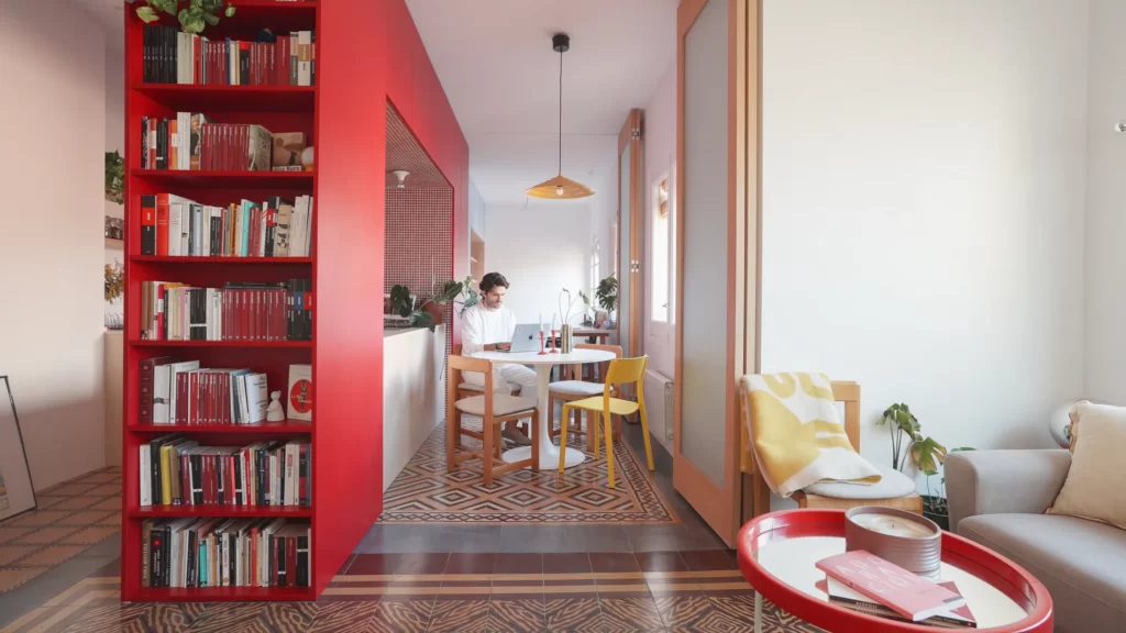 Στο κέντρο του διαμερίσματος βρίσκεται ένας κόκκινος όγκος. Στεγάζοντας την κουζίνα και συνδεόμενος απευθείας με την τραπεζαρία και το καθιστικό, λειτουργεί ως κεντρικός χώρος και όχι ως ξεχωριστό δωμάτιο. Ο μπλε όγκος προσδίδει ευελιξία στο διαμέρισμα, προσφέροντας έναν πολυχρηστικό χώρο που προσαρμόζεται στις ανάγκες του πελάτη. Μπορεί να χρησιμεύσει ως γραφείο, χώρος ανάγνωσης ή υπνοδωμάτιο επισκεπτών, κλείνοντας με συρόμενα χωρίσματα από παγωμένο γυαλί όταν απαιτείται ιδιωτικότητα. Τέλος, ο πράσινος όγκος χρησιμεύει ως όριο μεταξύ των κοινωνικών χώρων του σπιτιού και των πιο ιδιωτικών.