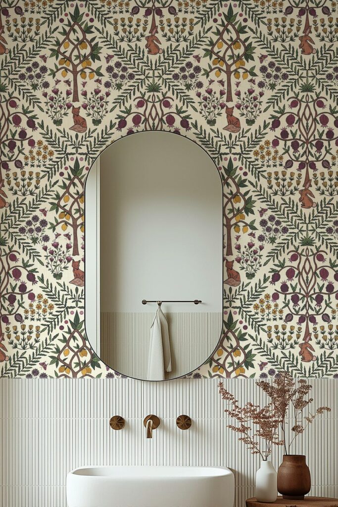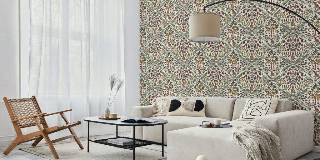 Στην προκειμένη περίπτωση, το μοτίβο με φυτά, λουλούδια και μικρά ζώα έχει έναν διαχρονικό, οργανικό χαρακτήρα που μπορεί να προσαρμοστεί εύκολα σε διάφορα περιβάλλοντα. Αυτή η ταπετσαρία με το παιχνιδιάρικο μοτίβο από αλεπούδες, λαγούς, λεμονιές και ανθισμένα κλαδιά προσθέτει μια ζεστή, φυσική πινελιά σε κάθε χώρο. Σε ένα μοντέρνο σαλόνι λειτουργεί σαν ιδανικό αντίβαρο στις καθαρές γραμμές και τις minimal επιφάνειες, προσφέροντας χρώμα και χαρακτήρα χωρίς να «φορτώνει» το δωμάτιο. Ως accent τοίχος, δίνει αμέσως βάθος και προσωπικότητα, τραβώντας το βλέμμα και δημιουργώντας μια αίσθηση καλλιτεχνικής σύνθεσης που δένει όμορφα με ξύλινα έπιπλα, γήινες υφές ή ακόμη και πιο σύγχρονα μεταλλικά στοιχεία.
