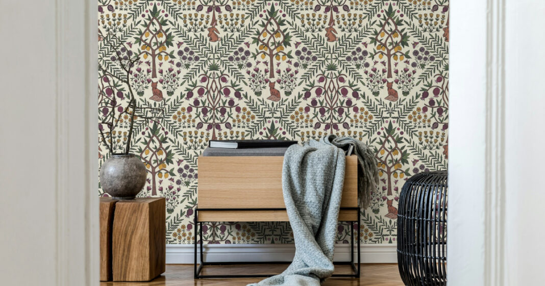 Αυτό το είδος ταπετσαρίας λειτουργεί τόσο σε μικρούς όσο και σε μεγάλους χώρους, καθώς η ισορροπία μεταξύ χρωμάτων και σχεδίων δημιουργεί ένα ευχάριστο, αρμονικό αποτέλεσμα που ταιριάζει σχεδόν παντού. Οι απαλές φθινοπωρινές αποχρώσεις και οι πυκνές υφές θυμίζουν παλαιωμένο λινό και αντίκες κεντήματα σε αυτό το χειροποίητο, παραμυθένιο σχέδιο. Το folk σχέδιο της Happy Wall, είναι εμπνευσμένο εν μέρει από μεσαιωνικές ταπισερί, με τη συμμετρία του να δίνει δομή και τα χρώματα να δημιουργούν διαχρονική ζεστασιά.