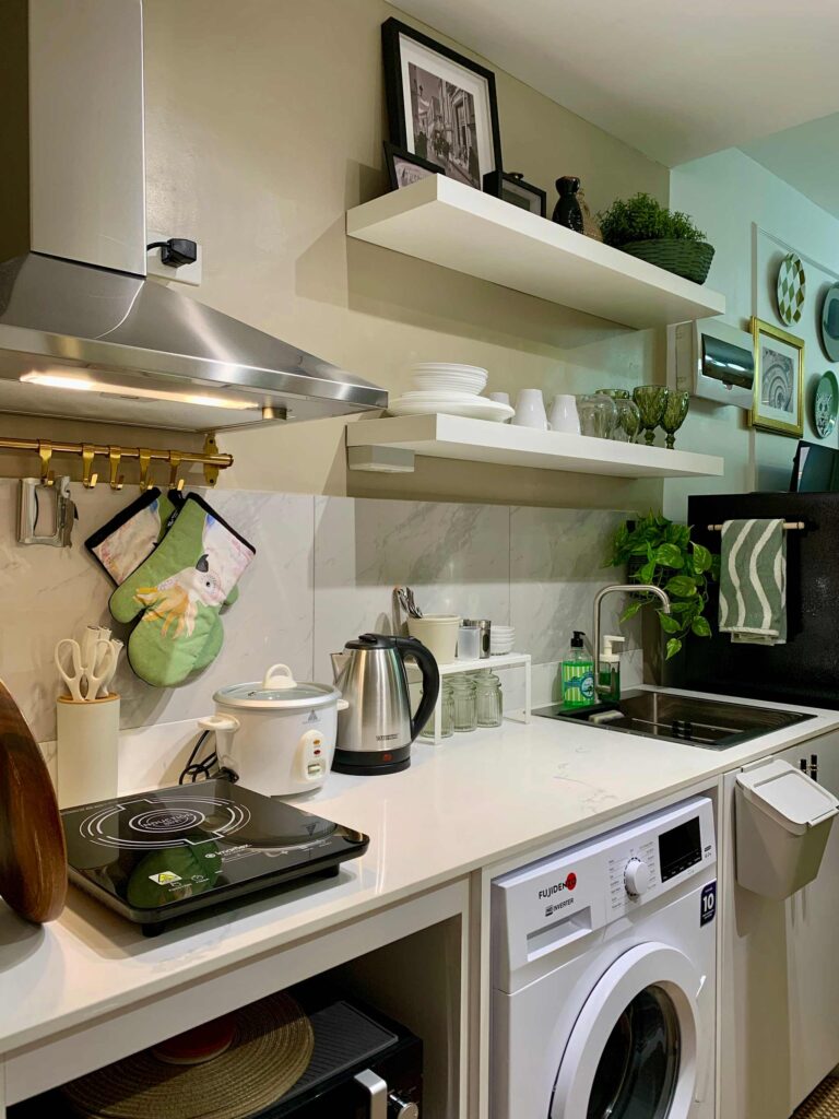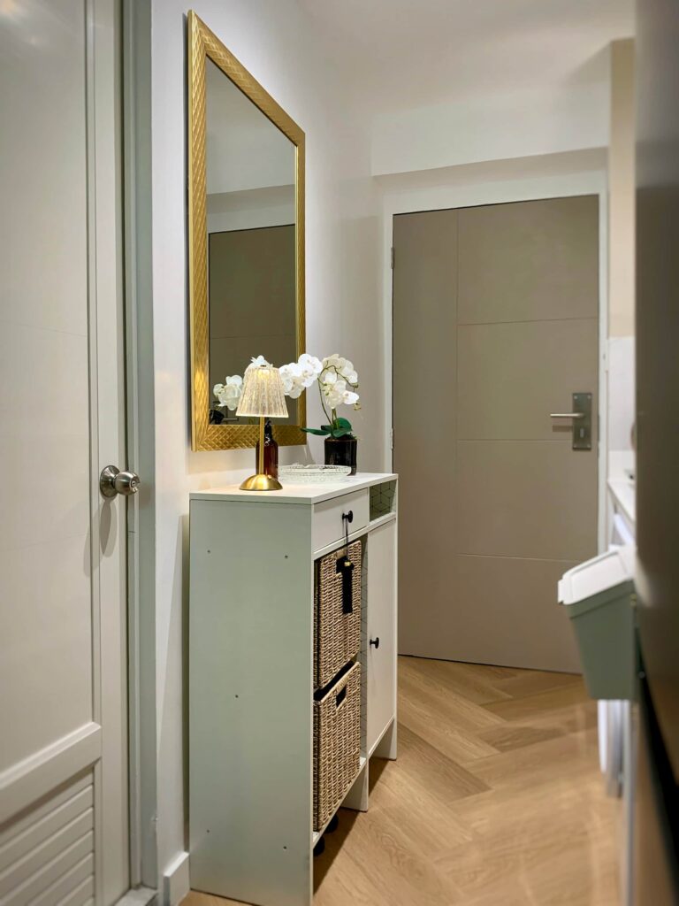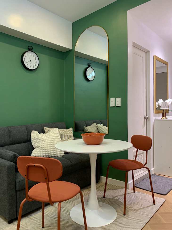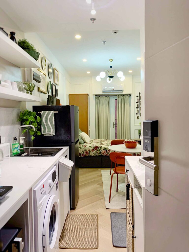 Η Mabel εξηγεί ότι αυτό το γωνιακό στούντιο, που βρίσκεται σε ψηλό όροφο, σχεδιάστηκε με γνώμονα τη βραχυπρόθεσμη ενοικίαση. «Κάθε έπιπλο επιλέχθηκε προσεκτικά για λειτουργικότητα, προσφέροντας ενσωματωμένο αποθηκευτικό χώρο ή διπλή χρήση, αξιοποιώντας στο έπακρο τον συμπαγή χώρο. Η διαρρύθμιση δίνει έμφαση στην αποτελεσματικότητα χωρίς συμβιβασμούς στο στυλ» γράφει. Αλλά ενώ προς το παρόν δεν είναι κατοικία πλήρους απασχόλησης, θα μπορούσε εύκολα να είναι, με το πόσο έξυπνα σχεδιάστηκε, παρά τα μικρά τετραγωνικά μέτρα. «Ο ιδιοκτήτης οραματίστηκε έναν καθαρό και λειτουργικό χώρο που έδινε προτεραιότητα στην απλότητα και στις επιλογές με γνώμονα τον προϋπολογισμό, χωρίς συμβιβασμούς στο στυλ» συνεχίζει η Mabel.