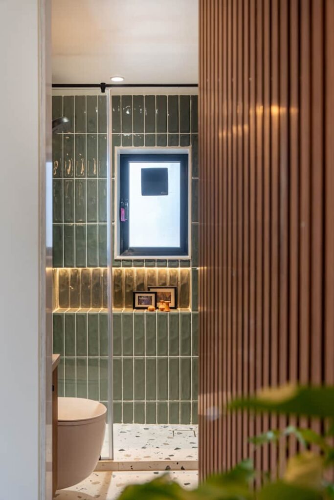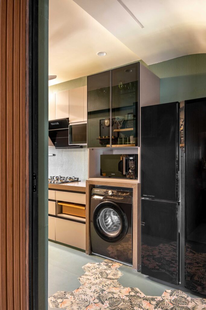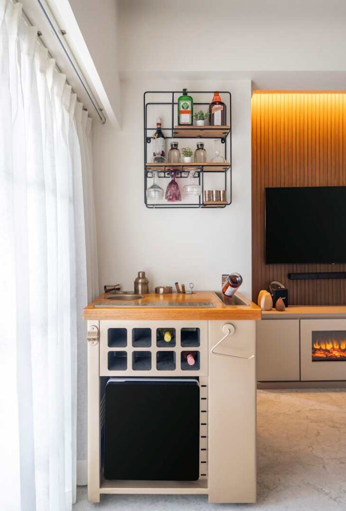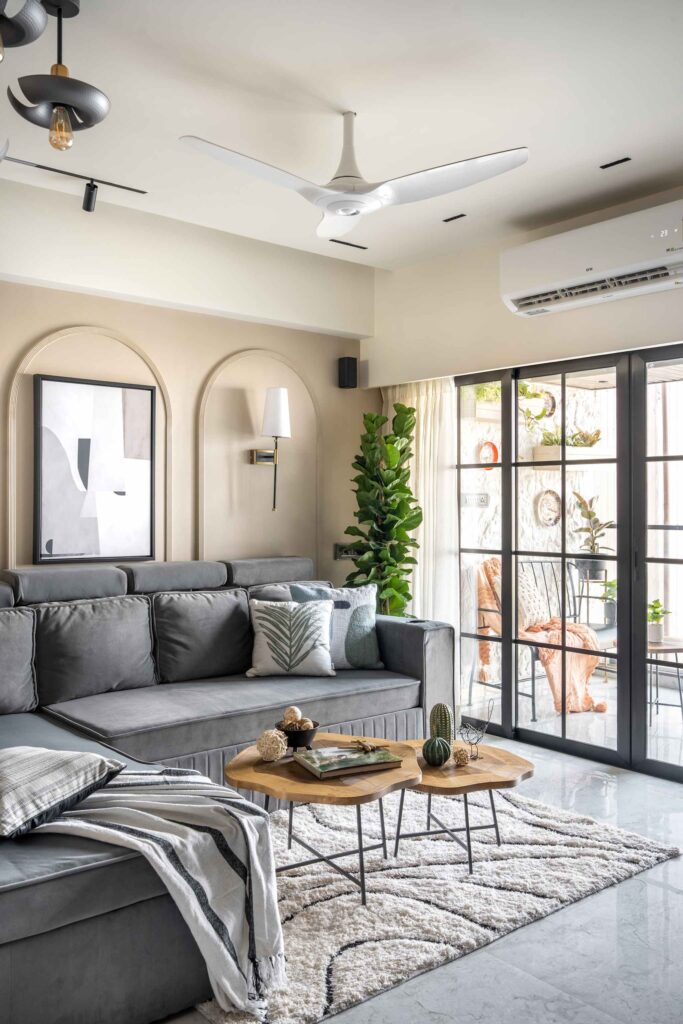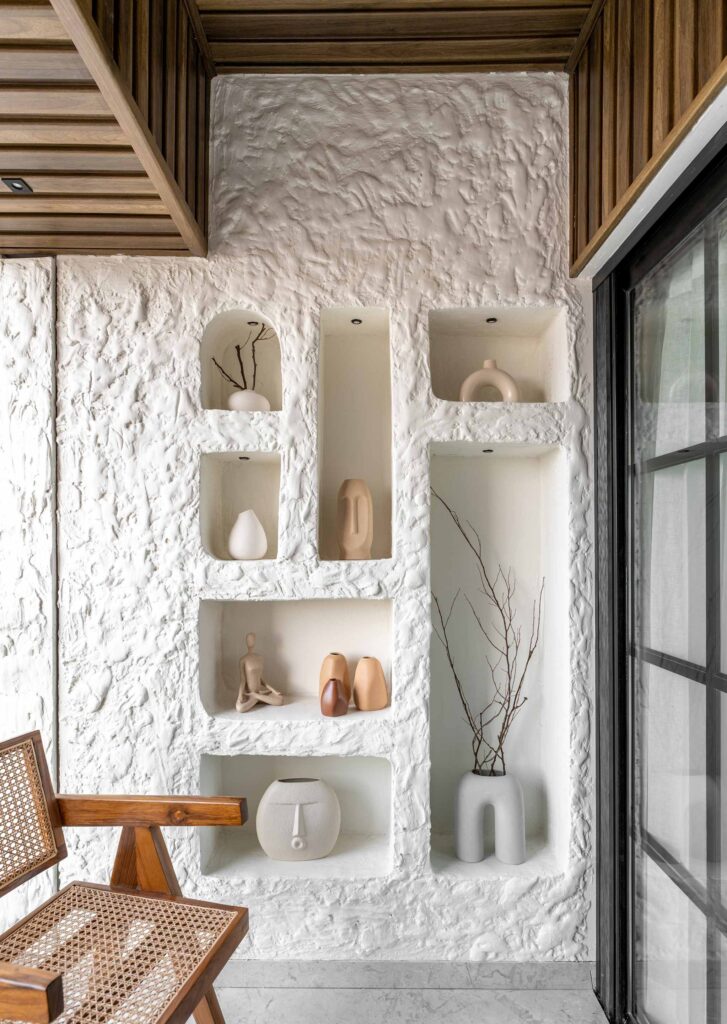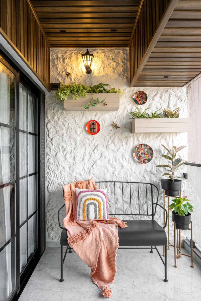 Ίσως το πιο εντυπωσιακό είναι ότι η 27MM Collaborative κατάφερε να δημιουργήσει ένα πολύ ωραίο εξωτερικό μπαλκόνι για το ζευγάρι, κλέβοντας έστω και λίγο χώρο από τον χώρο διαβίωσης. Ενώ η θυσία του εσωτερικού χώρου για τη δημιουργία εξωτερικού δεν θα λειτουργούσε για όλους, ήταν η τέλεια σχεδιαστική απόφαση για τον Anil και τη Nidhi, και το στυλ του μπαλκονιού – που θυμίζει την λευκή αρχιτεκτονική της Ελλάδας – το καθιστά την τέλεια προσθήκη στο σπίτι τους με θέμα τα ταξίδια.