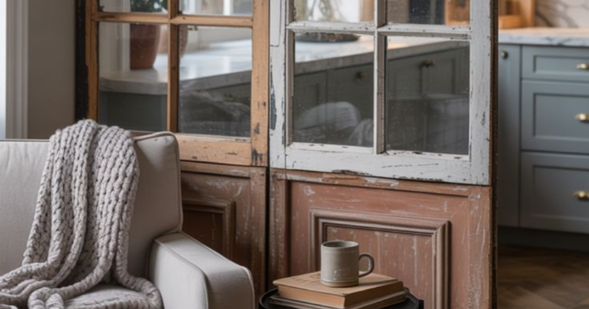 Οι ανεξάρτητες πόρτες που χρησιμοποιούνται ως διαχωριστικό χώρου, όπως αυτές στη φωτογραφία, αποτελούν μια εξαιρετικά ατμοσφαιρική και δημιουργική λύση εσωτερικής διακόσμησης. Πρόκειται συνήθως για παλιές ξύλινες πόρτες με τζάμια, οι οποίες είτε προέρχονται από αναπαλαιωμένα σπίτια είτε αποκτώνται ως vintage κομμάτια. Η χρήση τους ως οπτικό όριο μεταξύ δύο χώρων επιτρέπει τον διαχωρισμό χωρίς να στερεί το φυσικό φως ή την αίσθηση ενιαίου χώρου. Οι επιφάνειες με πατίνα και τα εμφανή σημάδια φθοράς προσδίδουν ζεστασιά, χαρακτήρα και μια αίσθηση ιστορίας στο περιβάλλον.
