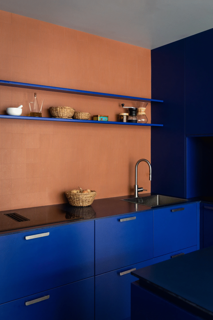 Ένα εντυπωσιακό παράδειγμα αυτής της προσέγγισης προέρχεται από ένα έργο του Noa Peer του OUI | Office for Urban Innovation. «Το σημείο εκκίνησης για αυτήν την κουζίνα ήταν η επιθυμία των πελατών να εισαγάγουν ένα ηλεκτρικό μπλε στον χώρο» εξηγεί. Επειδή η κουζίνα βρίσκεται σε μια γωνιά χωρίς φυσικό φως, η ομάδα έστρεψε την προσοχή της στην ένταση της απόχρωσης: «Οι πιο σκούροι τόνοι ενισχύουν την ιδιαιτερότητα του χώρου και του δίνουν μια μοναδική ατμόσφαιρα». Η συμπληρωματική τερακότα που χρησιμοποιείται σε άλλα σημεία του σπιτιού εμφανίζεται ξανά στο backsplash της κουζίνας. Κατά τη διακόσμηση με κοβάλτιο, οι γήινες αποχρώσεις της τερακότας δημιουργούν μια όμορφη ισορροπία.