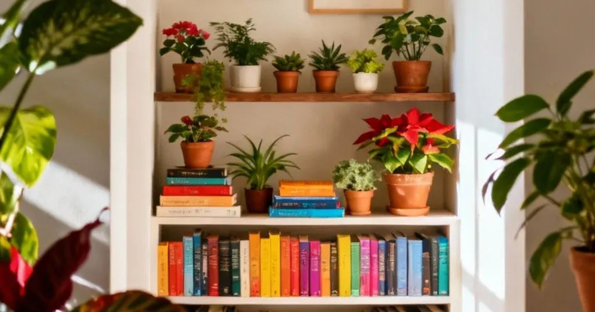 Στο εσωτερικό, συναντάμε τρία ράφια γεμάτα βιβλία, με διάταξη περιποιημένη αλλά όχι υπερβολικά αυστηρή, δίνοντας στο σύνολο έναν οικείο, καθησυχαστικό τόνο. Πάνω από τα βιβλία, δύο επιπλέον ραφάκια φιλοξενούν γλάστρες με φυτά, τα οποία προσθέτουν φρεσκάδα και φυσική ενέργεια στον χώρο. Τα διαφορετικά σχήματα και μεγέθη των φυτών ενισχύουν την αίσθηση ζωντάνιας.