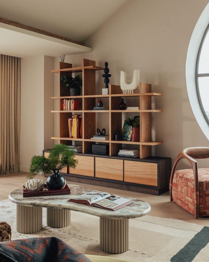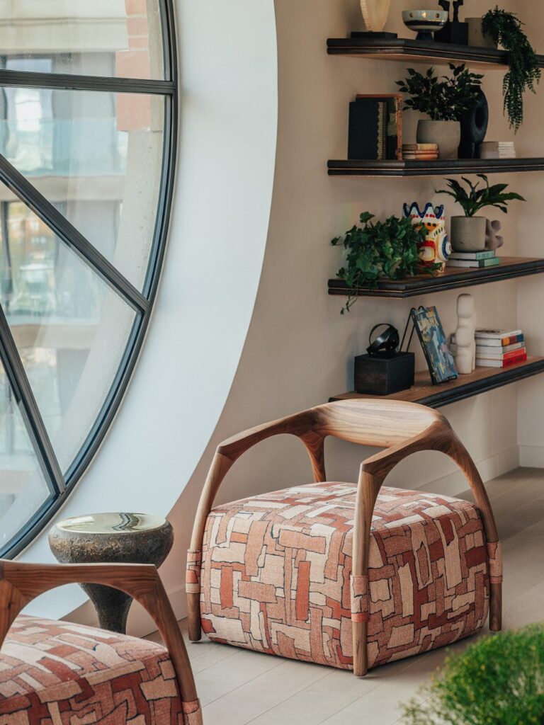 Θυμάται το αναπόφευκτο κρίσιμο σημείο που συμβαίνει πάντα στην αρχική φάση σχεδιασμού, «αφού αφαιρέσεις τις παρωπίδες και δεις τον χώρο για αυτό που είναι – καλό και κακό». Σε αυτή την περίπτωση, αυτός και η ομάδα εντόπισαν δύο αντίθετες προκλήσεις: στον επάνω όροφο, ένας εκτεταμένος ανοιχτός χώρος καθιστικού, μια ψηλή θολωτή οροφή και ένα τεράστιο παράθυρο απαιτούσαν ιδιαίτερη χωροθέτηση, υλικά σε ζεστές αποχρώσεις και πλούσιες λεπτομέρειες. Στον κάτω όροφο, μικρά παράθυρα με φεγγίτες και μια διάταξη που έμοιαζε με λαβύρινθο απαιτούσαν πιο cozy σχέδια.